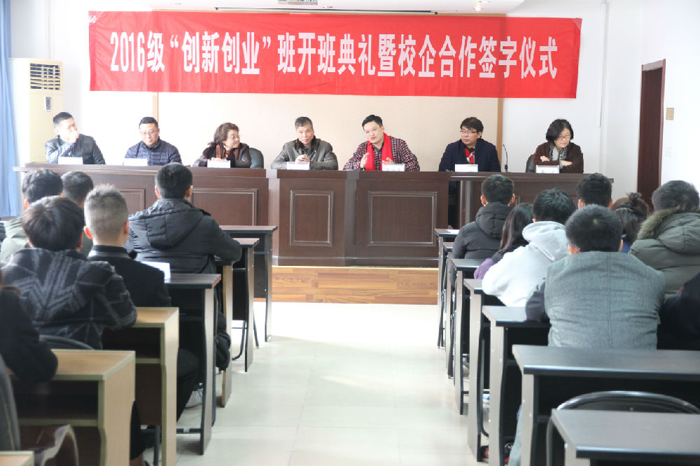 12月28日下午,经济与管理系召开2016级创新创业班开班典礼。副院长刘小廷、校企合作单位南京博峻集团董事长屈伯俊先生、总经理王翔先生、av在线 教务处处长吕立志、学生处处长姚强、经济与管理系领导共同参加了开班典礼。