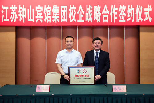 6月5日,av在线 与钟山宾馆集团校企战略合作签约暨揭牌仪式在省会议中心举行。院长庄群华、钟山宾馆集团董事长狄嘉、总经理朱银生出席签约仪式并致辞。副院长刘小廷,党政办公室、民用航空系负责人以及实习学生代表等参加仪式。仪式由钟山宾馆集团副总经理李骘义主持。
