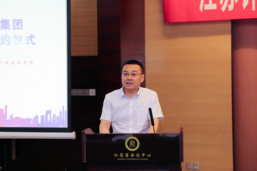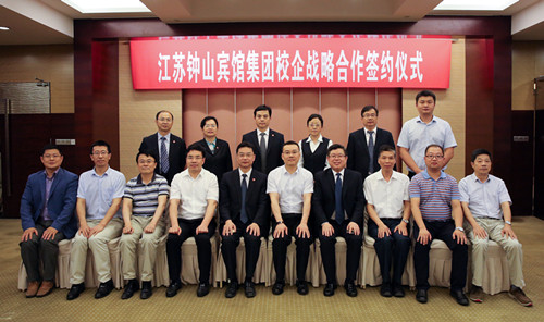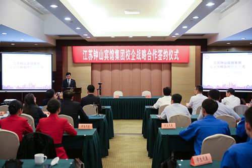 庄群华院长致辞。他指出,钟山宾馆集团是省内知名企业,在省内和国内有着重要影响力。学院与钟山宾馆集团保持着友好的合作关系,此次战略合作协议的签订,是校企双方深入贯彻落实省第十三次党代会“两聚一高”战略部署,探索校企合作新模式的有力举措。庄院长希望双方应抓住机遇,共同探索校企合作新领域、新途径,努力形成“优势互补、资源共享、互惠双赢、共同发展”的良好局面,为促进高等职业教育的发展,为推动江苏经济转型升级作出新的更大的贡献。