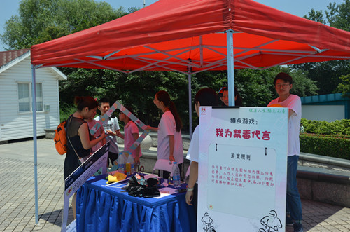 志愿者们乘车在南京青奥中心集合,穿上自己DIY的禁毒短袖,骑着共享单车到达了绿博园。一路上长长的车队构成一道美丽的风景,更是给禁毒做了最好的宣传。骑行到绿博园后志愿者们分为两队,一队负责向游客普及禁毒知识以及问卷调查,另一队则是在各个游戏点提供志愿服务活动。