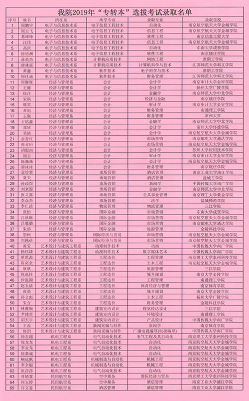 近日,从江苏省考试院收到av在线 2019年“专转本”选拔考试录取结果,av在线 2016级各专业共有65名同学分别被常州大学、金陵科技学院、南京体育学院、南京晓庄学院、南京信息工程大学、南京大学金陵学院、东南大学成贤学院、南京航空航天大学金城学院、苏州大学应用技术学院、中国传媒大学南广学院三江学院等24所本科院校录取,录取人数在同类院校中连续十七年名列榜首。