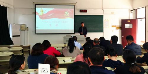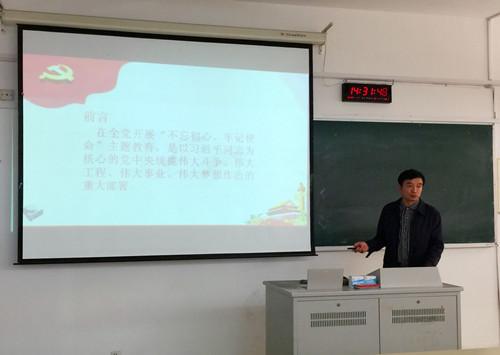 副院长薛忠云以《立德树人初心  人才培养使命——争做新时代合格共产党员》为题,为学生处、后勤处、保卫处全体党员讲授专题党课。他从主题教育的重大意义、目标任务、工作安排三个方面,以历史的视野带领党员从中国共产党诞生、发展、壮大不同历史阶段形成的革命精神中感悟“初心”的深刻内涵;从当前我们党所面临的“四大考验”、存在的“四大危险”的深刻反思中理解“使命”的重要意义。薛忠云要求全体人员严格对照标准,学做结合,知行合一,做到“五个过硬”;党员教师要坚持“四有标准”,即要有理想信念、有道德情操、有扎实学识、有仁爱之心,努力做一名新时代合格共产党员。