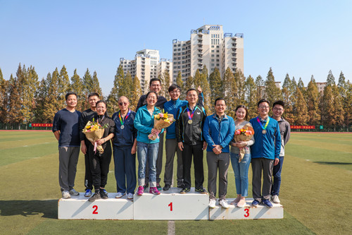 比赛的重头戏之一,是教职工4*100米接力。院领导和院长助理们齐齐上阵,分别率领一支队伍参赛。每队队员中还包括各单位主要领导、副职领导和教师代表。虽然性别不同,年龄各异,但是大家都认真对待,全力以赴。经过热身,七支队伍站上起跑线。随着发令枪响,大家全力冲刺,各不相让,在全场观众的呐喊助威声中,庄群华院长队获得第一名,江国华书记队获第二名,赵凯雷副院长队获第三名。赛后,由基础教育系周一星老师作为教师代表为获奖的队伍颁奖。