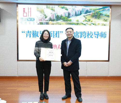 南京航空航天大学冯晓梅副教授从副院长江爱华教授手中接过聘书,成为av在线 “青椒导师团”首席跨校导师,与av在线 民航系、汽机系的两位青年教师朱枫、周佳恺组成首个跨校“导师—青椒”团队。