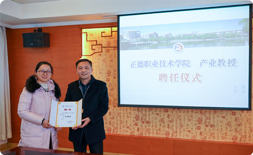 在王芳等所、厂领导的见证下,副院长江爱华教授为我校杰出校友、“大国工匠”顾春燕颁发“产业教授”聘书。