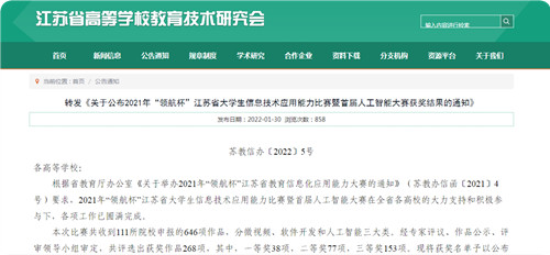 近日,江苏省高等学校教育研究会网站发布了《2021年“领航杯”江苏省大学生信息技术应用能力比赛暨首届人工智能大赛获奖结果》(苏教信办﹝2022﹞5号),av在线 有7项作品获奖,其中一等奖2项,二等奖2项,三等奖3项,获奖项目如图1所示。