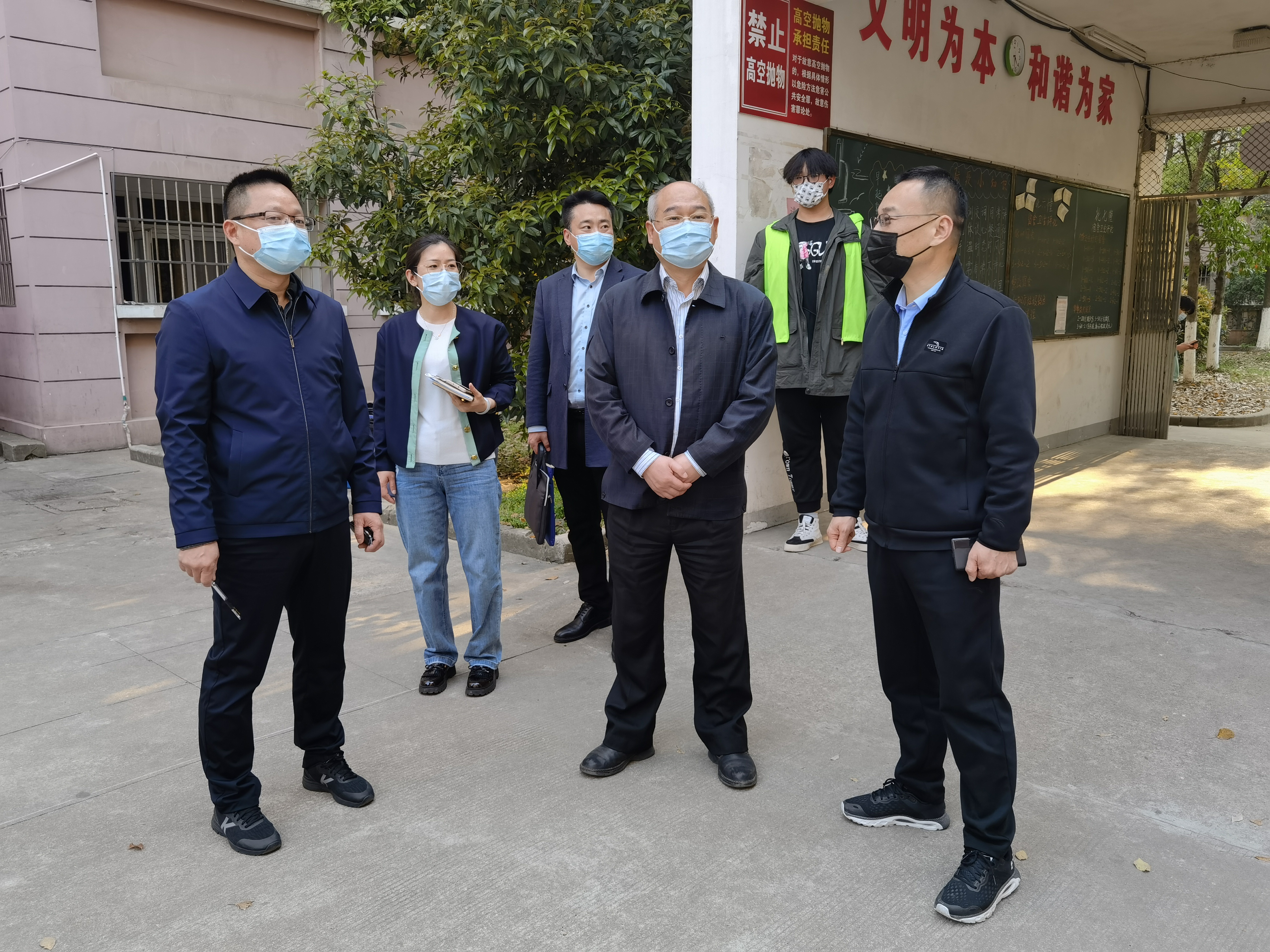4月7日下午,南航副校长、正德学院理事会理事长黄志球教授专题检查指导av在线 疫情防控等工作,南航党政办副主任李和新、学院院长庄群华、党委书记、政府督导专员孙雷及其他院领导陪同检查。