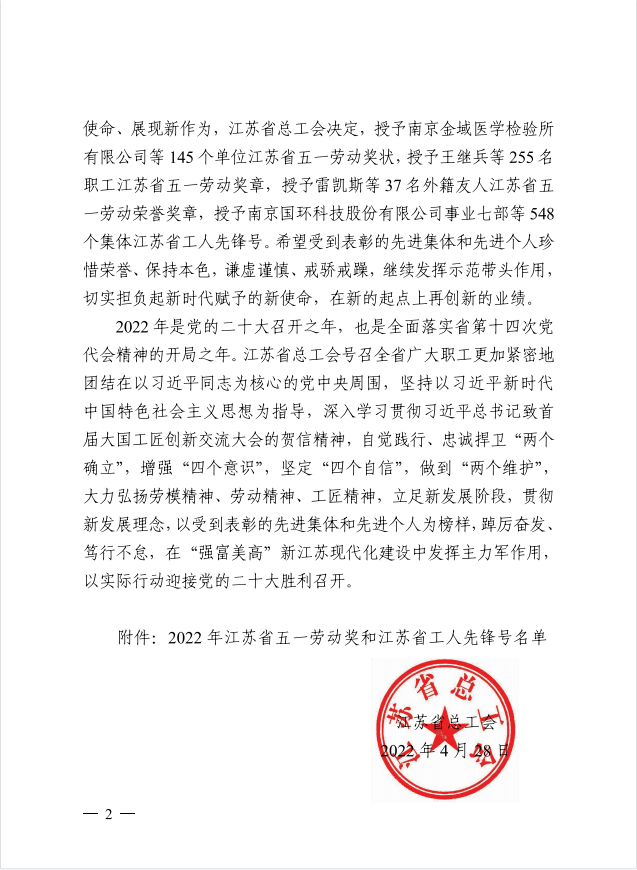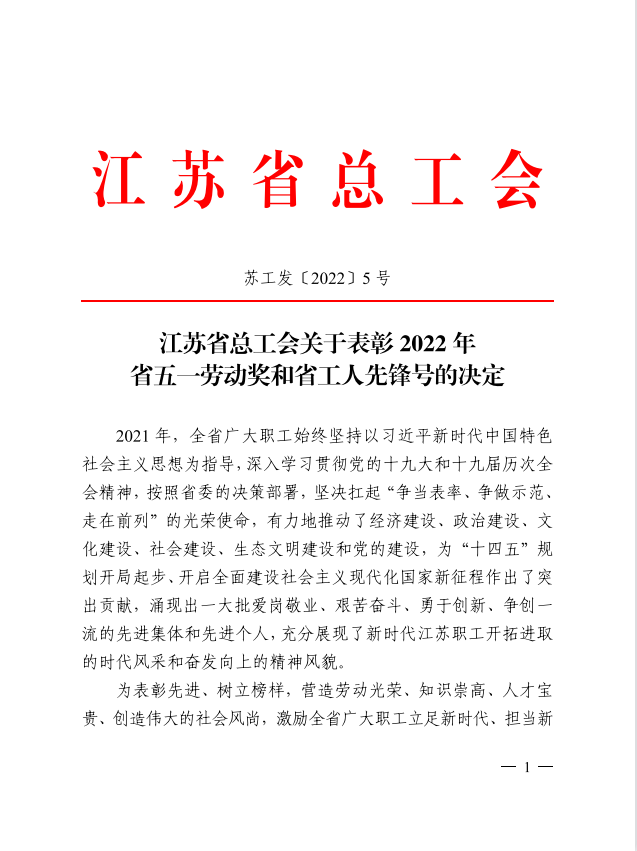 4月28日,江苏省总工会发布了《关于表彰2022年省五一劳动奖和省工人先锋号的决定》(苏工发[2022]5号),我校被授予省五一劳动奖状。