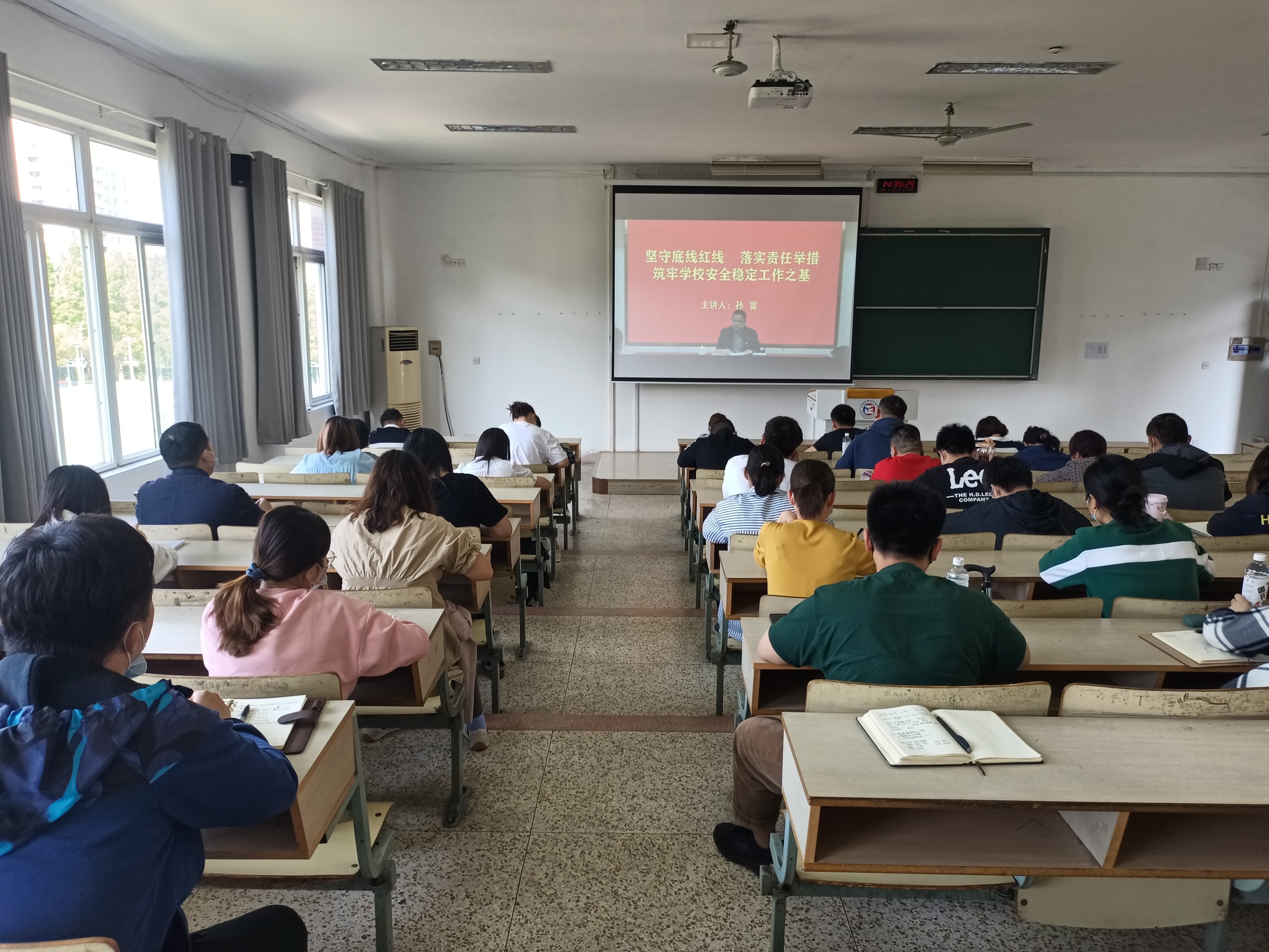 孙雷指出,校园内的安全隐患时刻存在,必须做到警钟长鸣,守牢安全稳定的底线,扎实做好三个方面的工作。一是要提高认识,持续拧紧学院安全工作“思想阀”。 要始终以勇于担当的责任感推进学院安全稳定工作;以时不我待的紧迫感抓好学院安全稳定工作;以如履薄冰的危机感对待学院安全稳定工作。二是要科学研判,全面排查学校安全稳定工作“风险点”。特别要针对政治生态环境营造、意识形态风险防范机制、新冠肺炎疫情防控、校园公共安全及学生心理健康等方面存在的问题进行重点排查。三是要精准施策,织密扎牢学院安全稳定工作“防护网”。要切实做到安全稳定工作理念再巩固、安全稳定工作责任再压实、安全稳定隐患再排查、安全稳定教育再深入、安全稳定工作机制再健全以及安全稳定重点领域安全管理再加强。