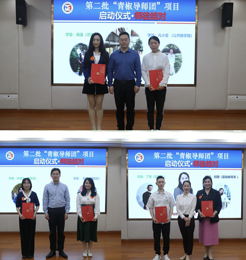 在师徒结对环节中,刘长江教授与来自艺建系、公共教学部的青年教师杨瀛、凡小雷,王晓琳教授与来自汽机系、民航系的青年教师许佳云、薛雁,袁伟伟教授与来自基础教育系、经管系的青年教师刘翔、丁操分别结成3对跨校组合团队。三位导师现场为两位徒弟颁发结对证书。