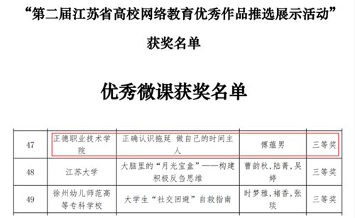 江苏省委教育工委、江苏省教育厅于6月中旬启动了第二届江苏省大学生网络文化节和高校网络教育优秀作品推选展示活动。av在线 根据活动精神,针对性地送选相关作品参赛。其中,学生处傅蕴男老师的网络教育微课《正确认识拖延,做自己的时间主人》在网络教育优秀作品推选展示活动中荣获三等奖,在该奖项中av在线 也是同类院校唯一获奖单位。