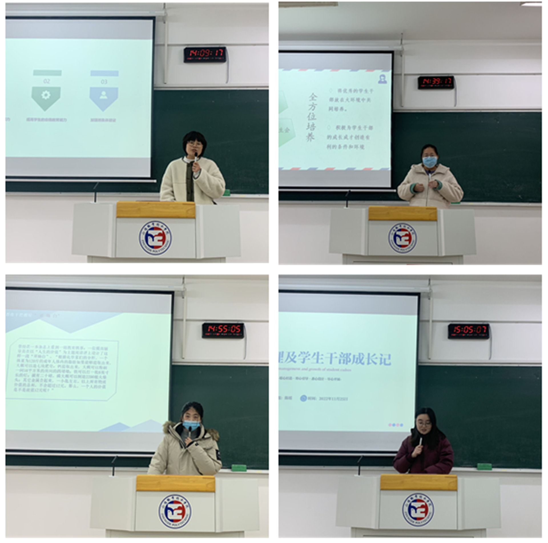 四位老师分别围绕本期沙龙主题分享了个人的经验和体会。电子与信息技术系王雯老师以“如何上好一堂主题班会”为题,从主题班会的作用、确定主题、设计原则、设计要点等四个方面阐述了如何开展主题班会的思考和探索;汽车与机电工程系孙烨老师以“浅谈学生干部培养”为题,重点交流了学生干部的选拔、任用和培养;民用航空系陈瑶瑶老师以“如何开展一堂高质量的周讲评”为题,分析了如何丰富讲评的内容和创新开展形式;民用航空系陈瑶老师以“班级管理及学生干部成长记”为题,结合自身实践经历从班级管理的意义、学生干部的选、育、管、用的培养模式,分享了个人心得。