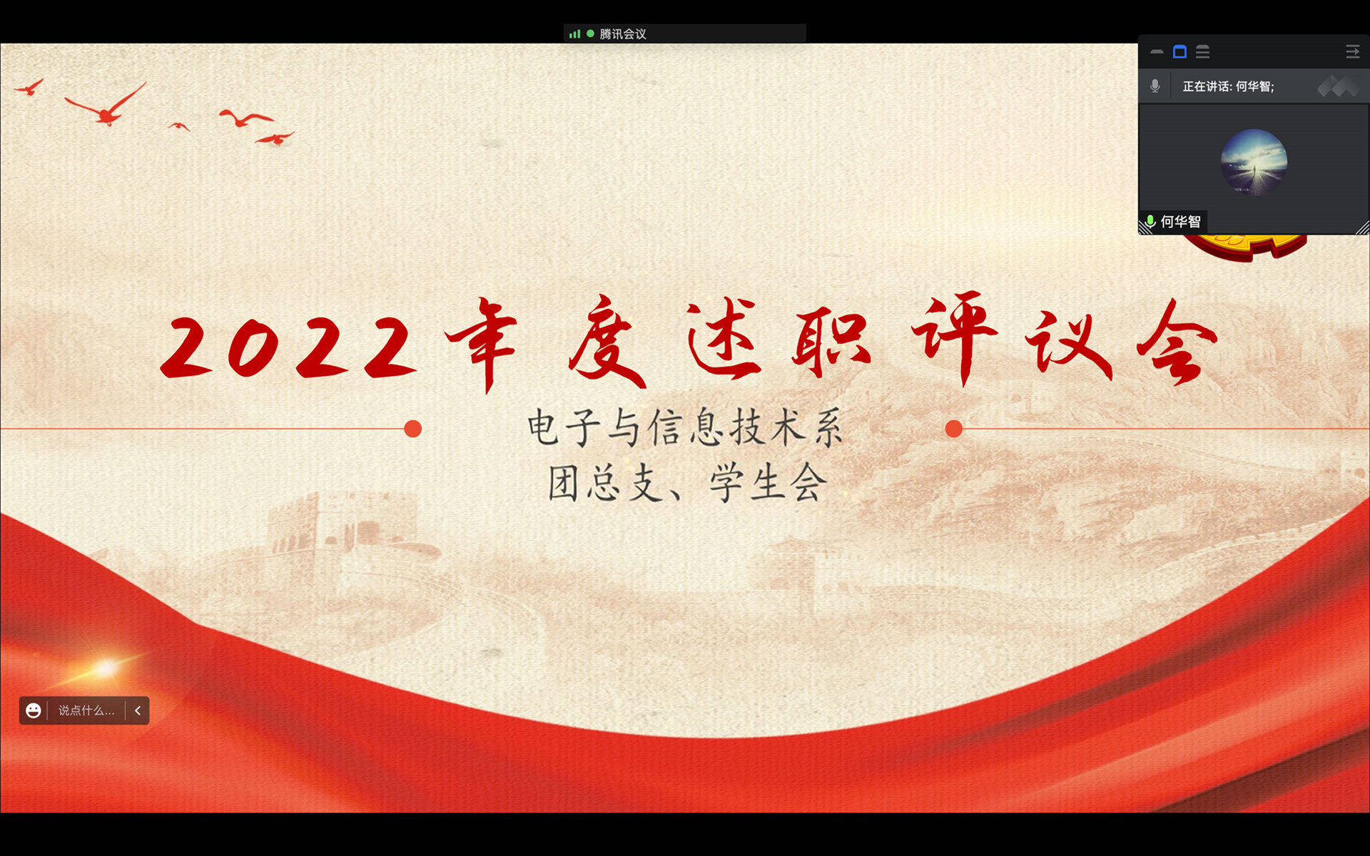 为了更好地总结2022年度电子与信息技术系团总支、学生会的各项工作,加强对团总支、学生会成员的管理,进一步促进团学工作的开展,电子与信息技术系于12月12日下午3时30分通过腾讯会议线上举办2022年度述职评议会,会议由系团总支书记何华智主持。