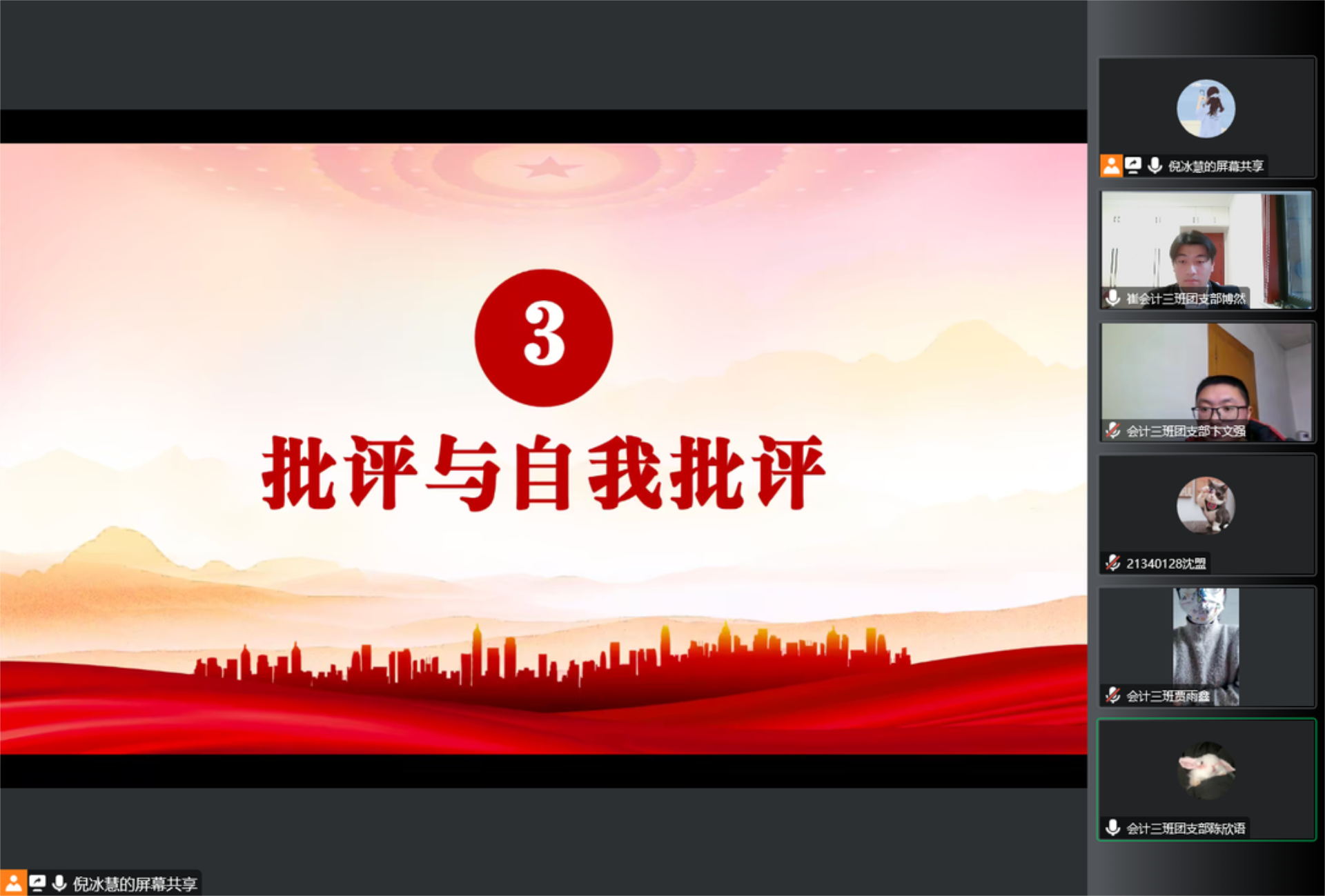 其次,陈欣语就过去一年的工作和本支部开展学习党的二十大精神相关工作进行了汇报,并结合支部实际情况制定了后期的学习计划。在批评与自我批评环节,团员们结合个人实际经历,深刻反省了开学以来各自在部分方面的不足,也明确了今后努力的方向。