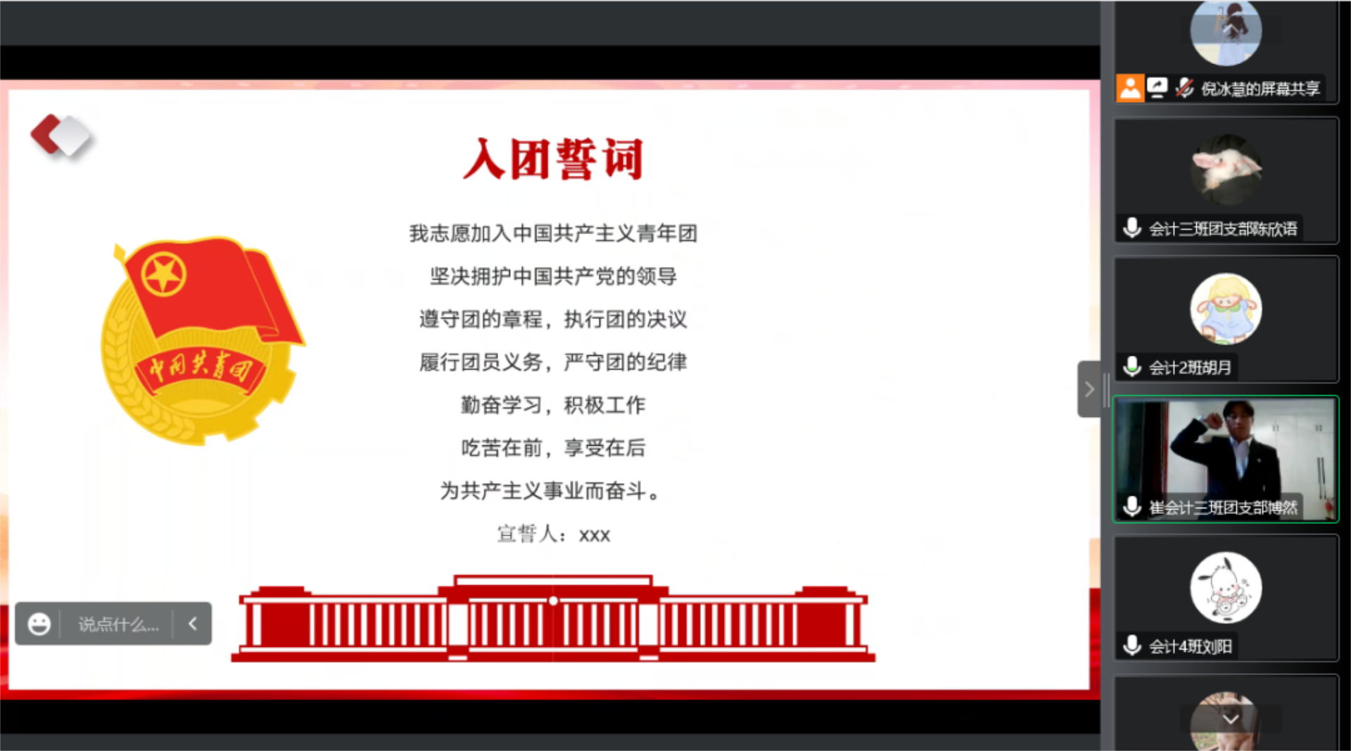 会议在嘹亮的团歌声中拉开帷幕。会上,团支书陈欣语以“学习贯彻落实党的二十大精神”为主题与同学们进行了分享交流,强调了广大团员和青年学生应该发扬自信自强、守正创新、踔厉奋发、勇毅前行的精神。