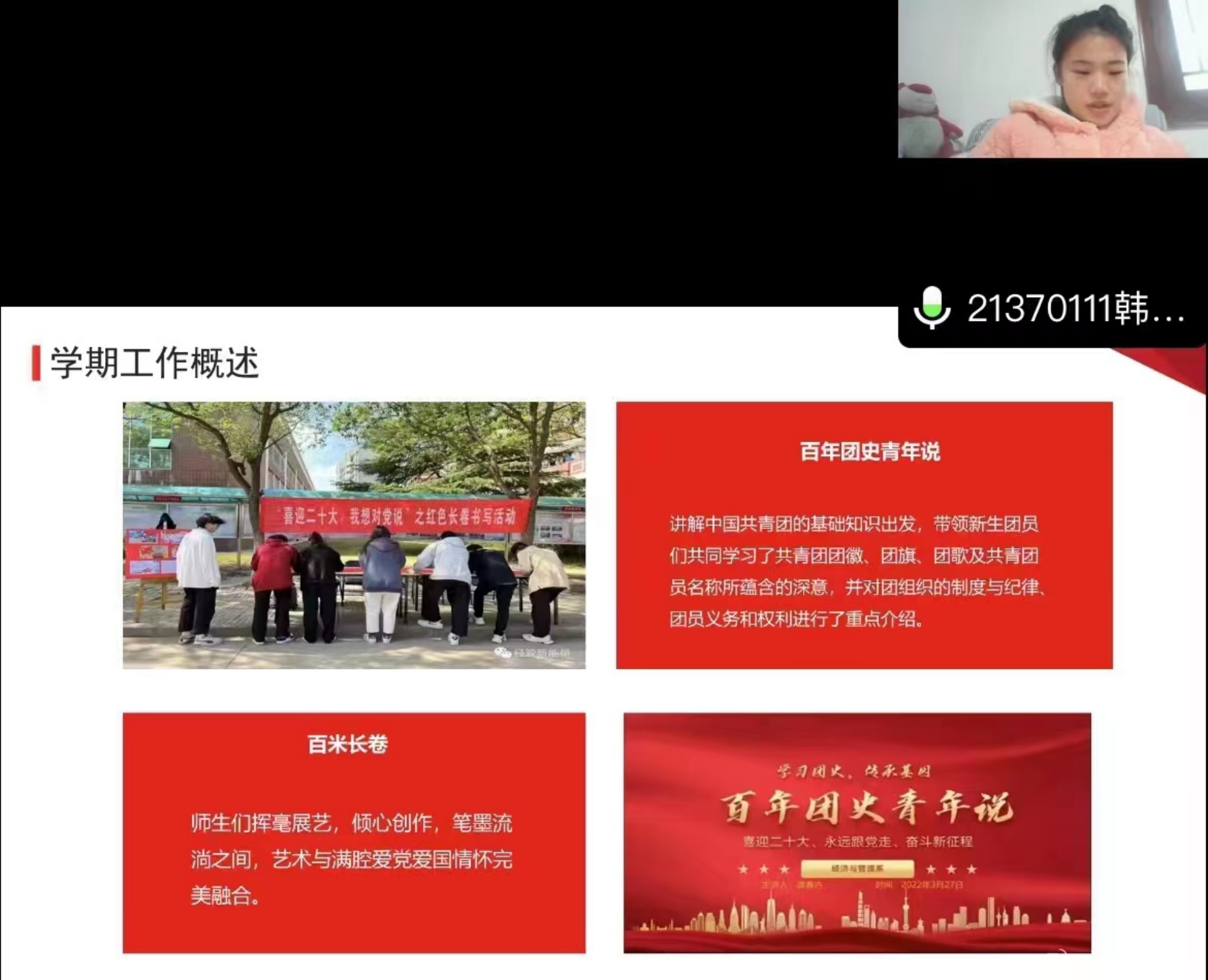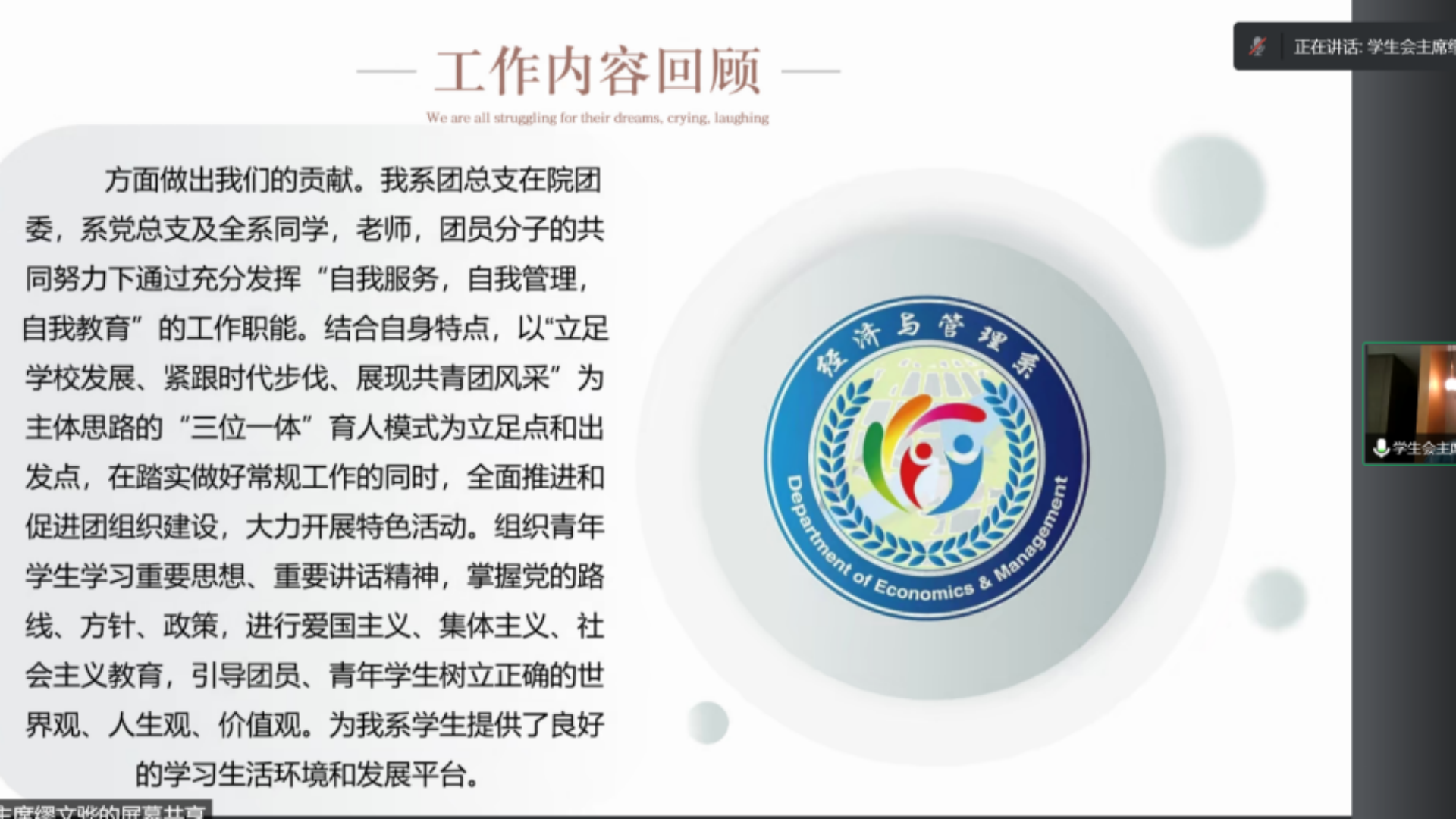 时至岁末,本学期也即将走向尾声,为宣传贯彻党的二十大精神,提高学生干部的责任意识、服务意识和大局意识,深化学生会改革落实述职评议工作,经济与管理系于12月15日在腾讯会议开展了“经管系团总支 学生会述职评议会” 。经济与管理系团总支书记倪冰慧老师,团总支副书记、学生会主席团、各部门部长及全体成员参加会议。