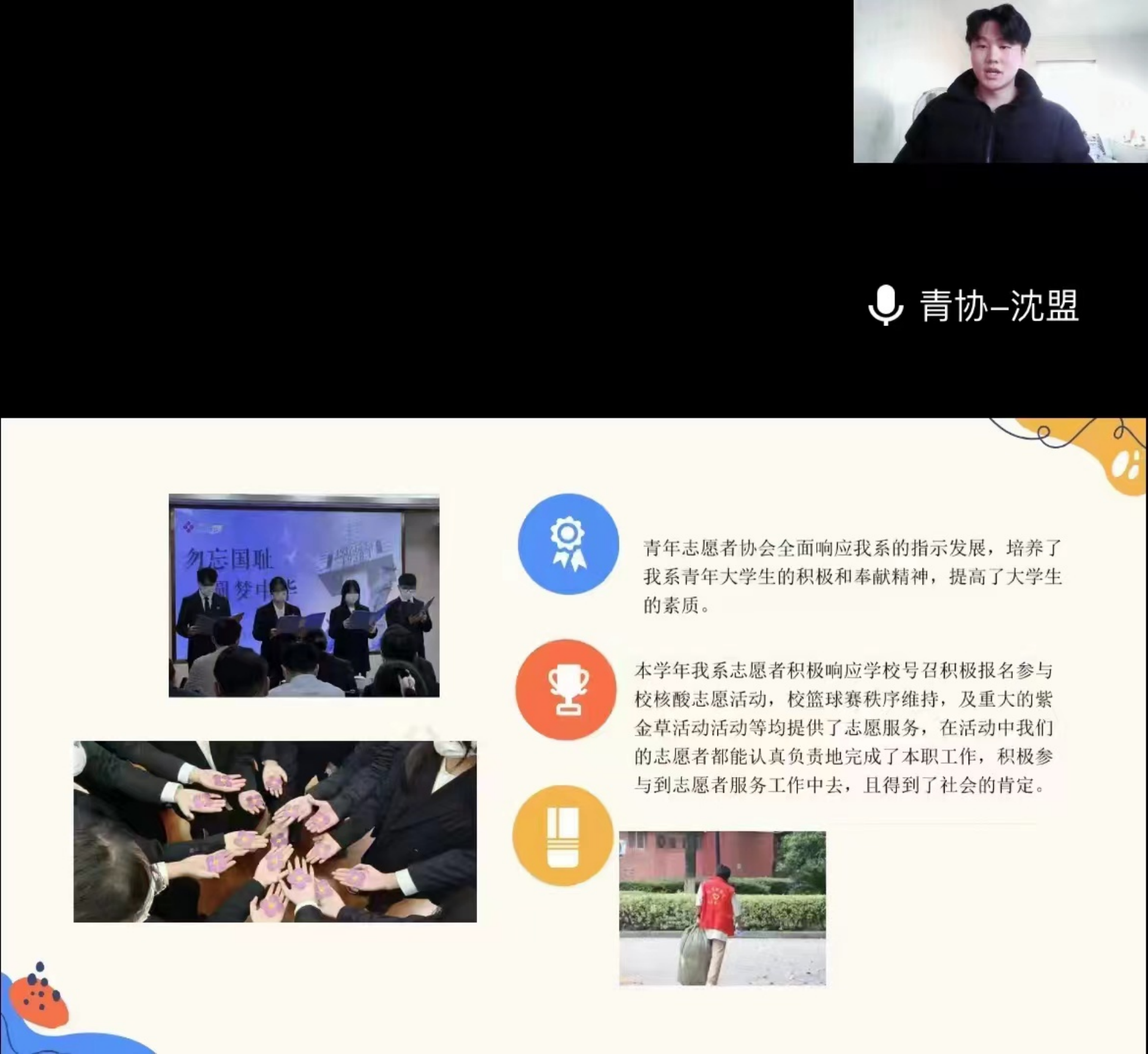 紧接着是办公部部长的总结汇报,主要以学期工作的概述、组织开展、工作总结和明年计划四个方面讲解。要提高效率和服务质量,精心策划,尽心尽力组织好每一个会议和活动,实践中学习,学习中提高,努力提高适应新形势和完成新任务的能力;青年志愿者协会进行工作报告,工作内容的回顾和完成的情况以及未来规划。