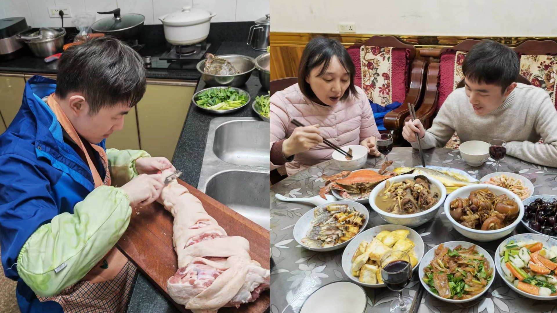 刘洋同学寒假时间在家里承担做家务活的任务,并学习给家人制作美味佳肴。他认为,除夕的夜饭,既是一年辛苦忙碌、辞别旧岁的重要时刻,又有迎接新年的特殊意义。他与父母分工合作,做出了一顿丰盛的年夜饭。家人之间的温馨和关爱让这个快节奏的时代慢了下来,一家人敞开心扉、互相祝愿。他说,“走过了坎坷的2022年,愿2023年的所有美好,如期而至。过往皆序章,未来可期盼。新的一年愿父母安康!”