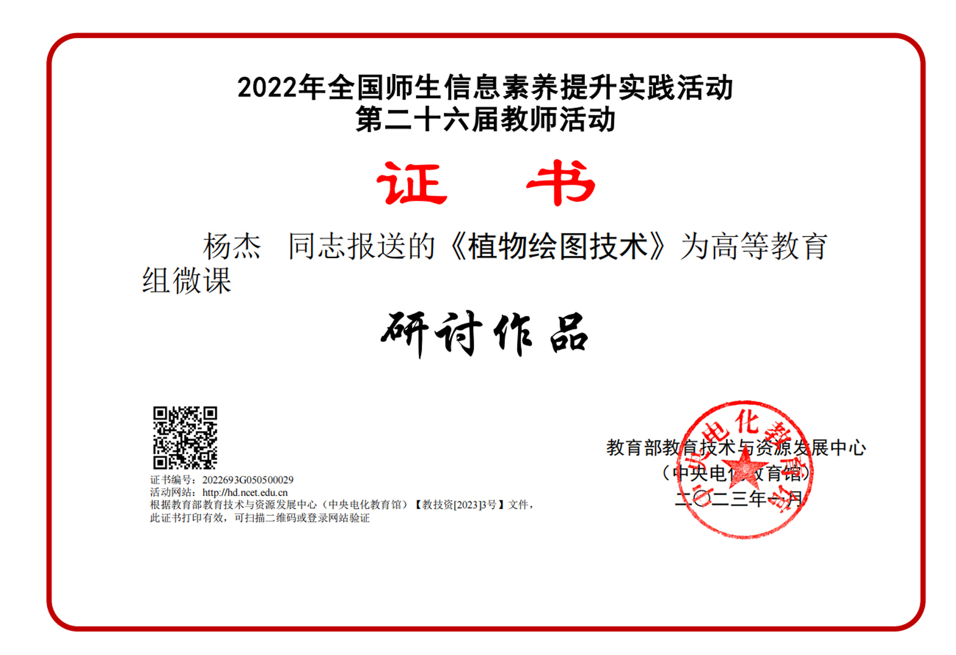 在近日由教育部教育技术与资源发展中心 (中央电化教育馆)主办的2022年度教育技术微课活动,av在线 艺术设计与建筑工程系杨杰老师的微课《植物绘图技术》荣获“研讨作品”。本届微课活动是由“省赛-国赛”的竞赛体系构成,省赛获奖的作品经遴选后,送往国赛进行竞赛。