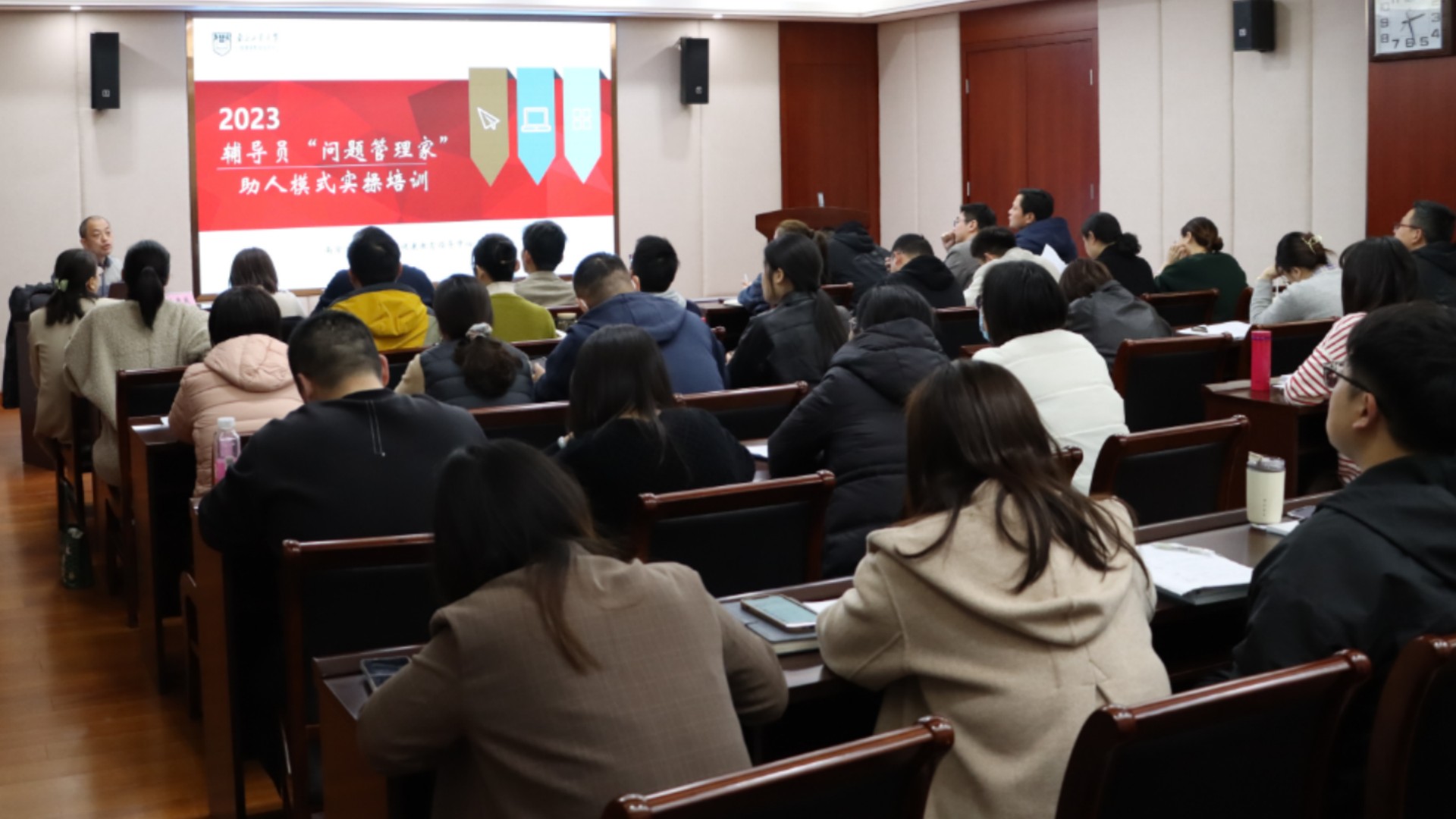 为有效提高辅导员谈心谈话技能,切实增强学生思想政治教育工作效能,进一步提升av在线 学工队伍工作水平,加强学工队伍职业化、专业化建设力度。3月14日下午14点30分,av在线 邀请南京工业大学心理健康教育指导中心主任、江苏省大学生心理危机干预专业委员会委员朱巍巍老师来av在线 开展“辅导员谈心谈话技能提升”专题培训。院长助理王健、学生处副处长张宝华、各系学生工作负责人、全体辅导员及心理中心专职教师参加了本次培训,培训会由张宝华主持。