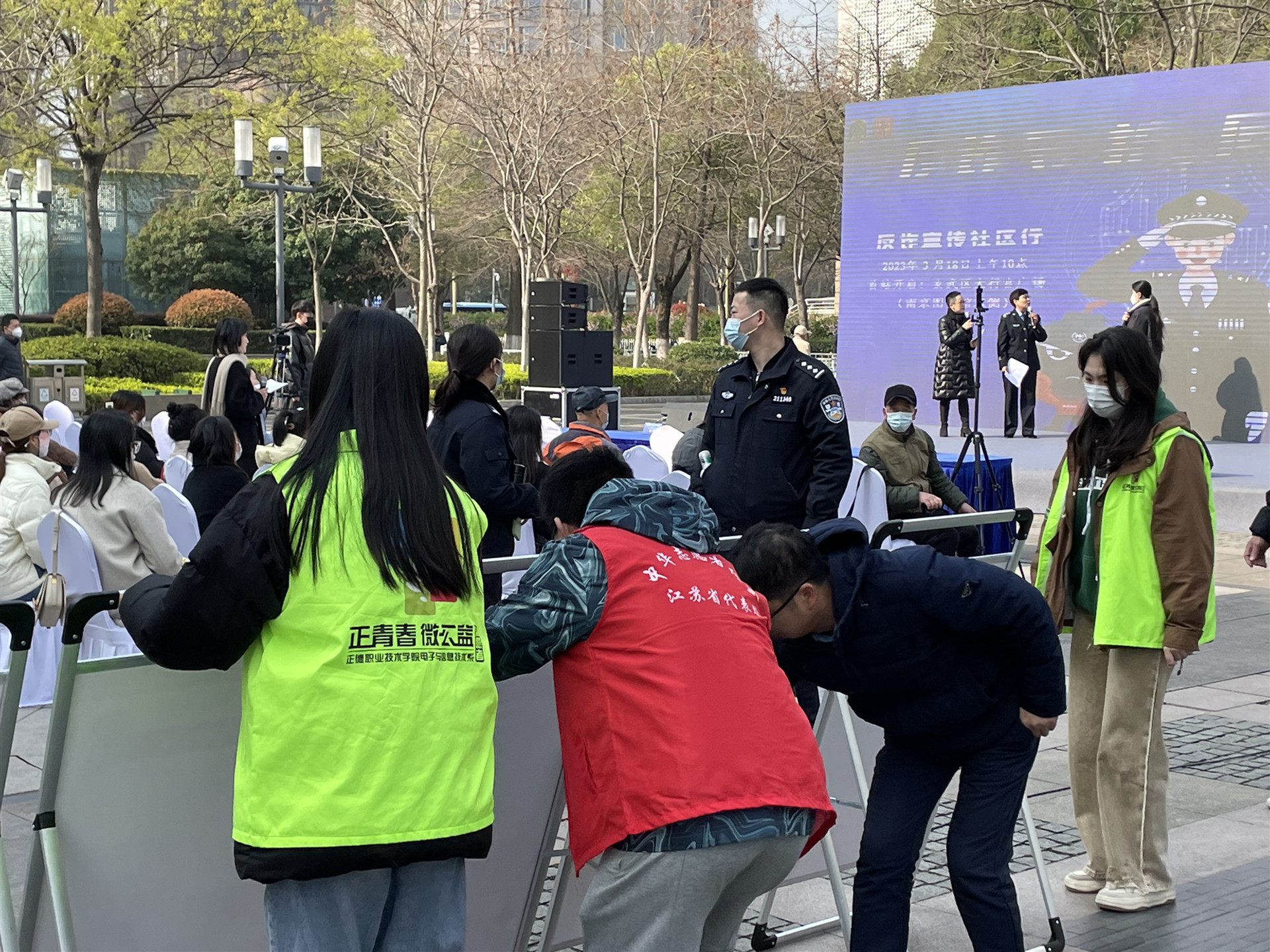 活动开始前,志愿者们就已经来到大行宫广场协助场地布置。反诈中心民警向志愿者简要解读了《反电诈法》的相关条例,并以辖区内的实际案件为例进行生动讲解,提醒居民不轻信、不刷单、不汇款,远离电信网络诈骗。