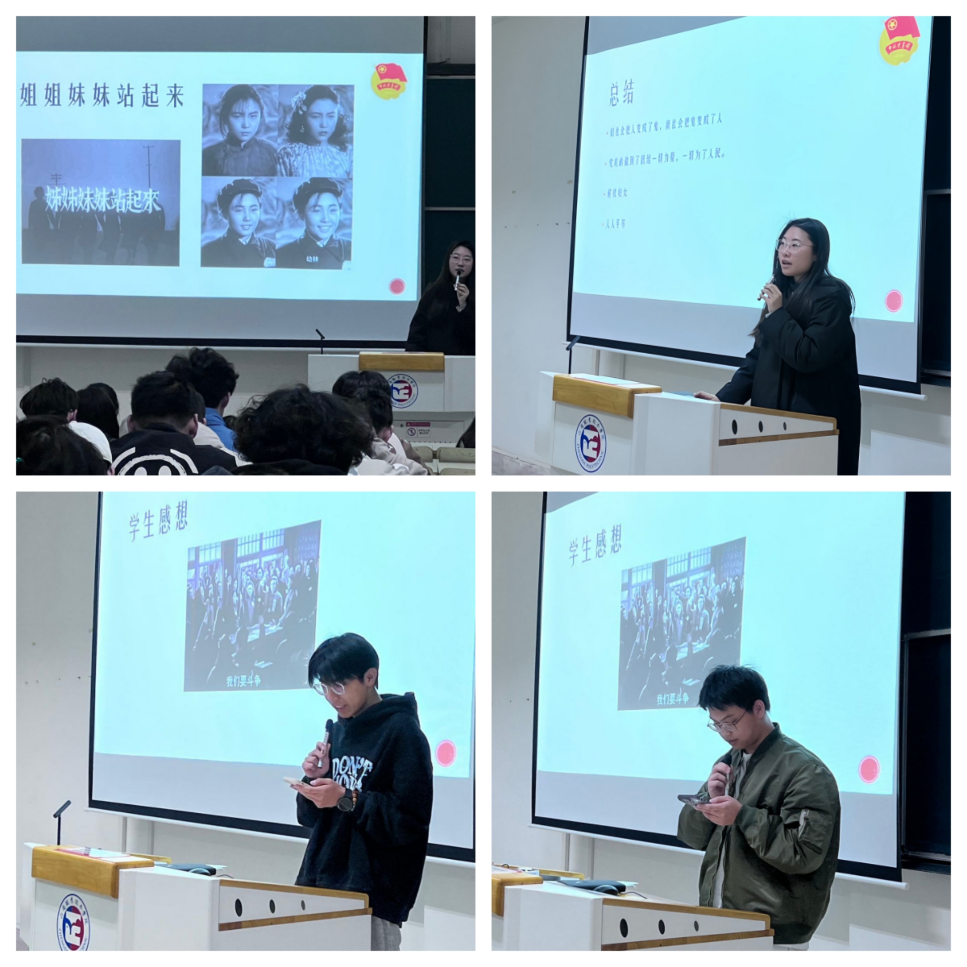 活动中同学们集体观看电影«姐姐妹妹站起来»,电影讲述解放军的到来结束了旧社会时贫苦百姓的悲惨命运,使他们也可以像平常人一样工作。学生深刻地体会到党的重要性,了解了封建社会对穷苦百姓的剥削,并坚信要跟随党的步伐,坚持党的领导。