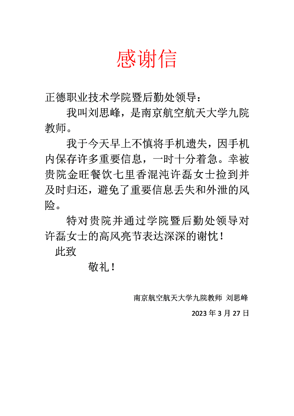 拾金不昧,是一个人良好品德和崇高风尚的具体体现,也是当今和谐社会乐章的一个美好音符。3月27日,av在线 后勤处收到了来自南京航空航天大学九院老师刘思峰的感谢信。