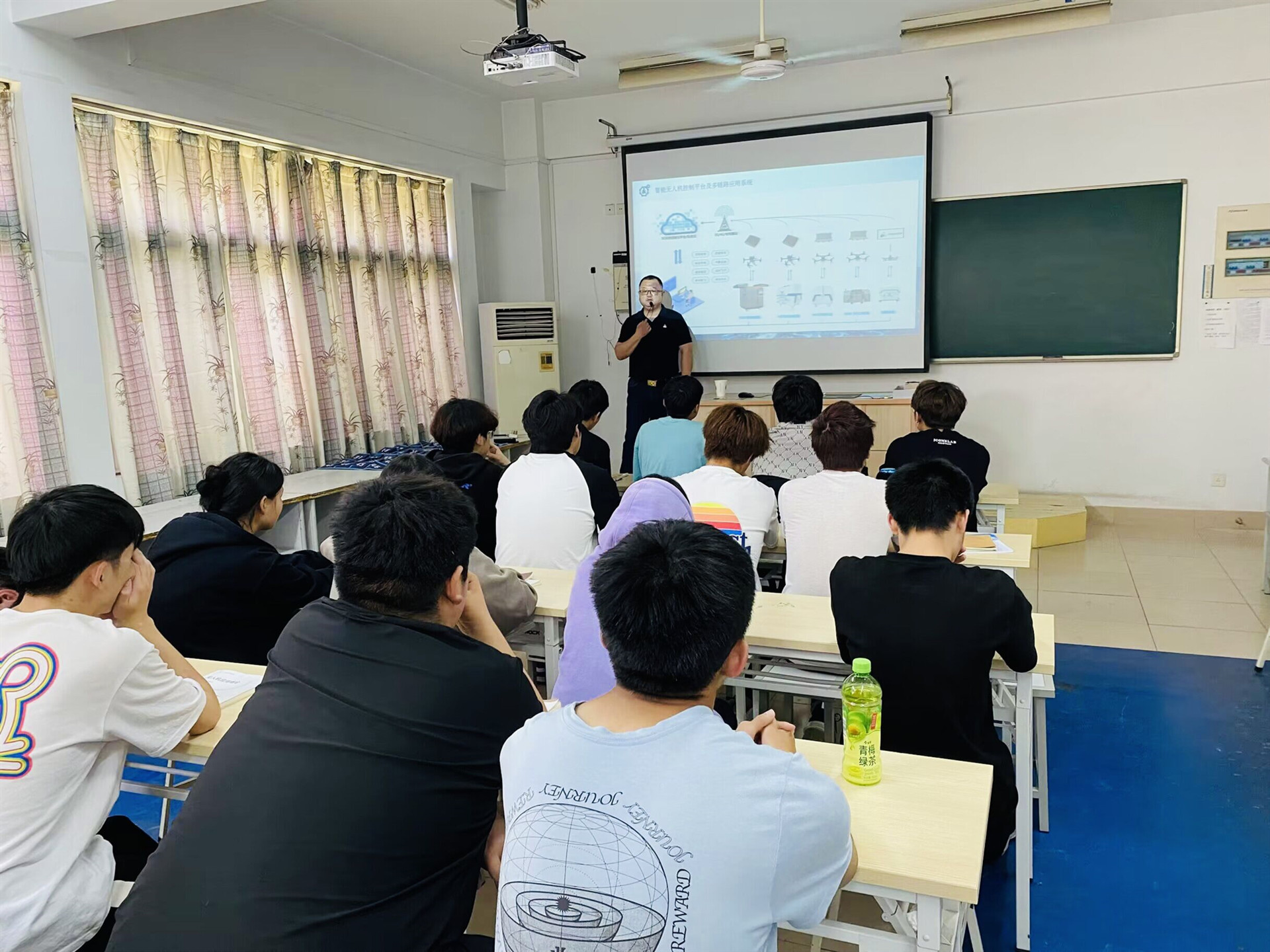 赵筱捷向同学们简述了国内外无人机技术的发展历程,详细介绍了无人机新技术带来的智能经济发展下的技术创新,通过几段短片,将同学们带入无人机航拍世界,并向大家分享了无人机技术在环保、救援、农业等领域的应用实践。