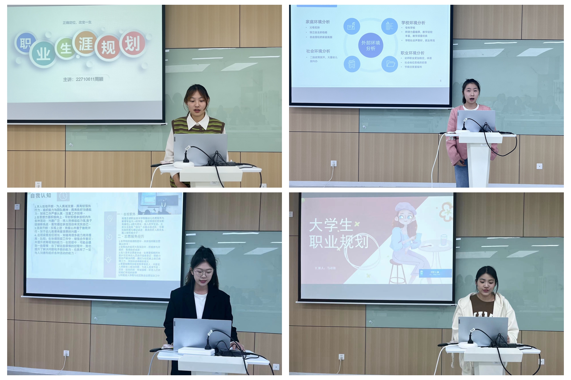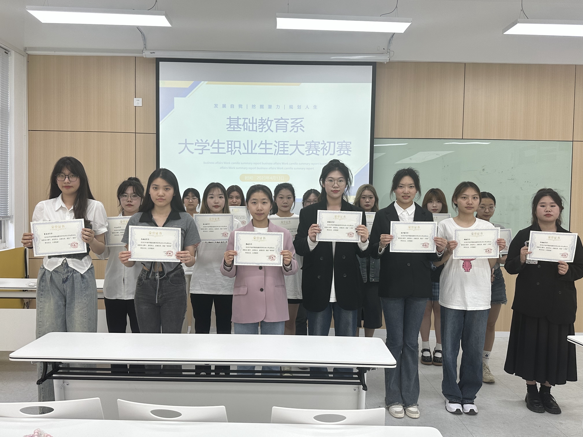 为践行“就业育人”的理念,激发大学生的职业规划意识,旨在帮助同学们认识和完善自我,激发自我潜能,树立职业生涯设计理念,尽早开始对未来职业发展的规划与实践。基础教育系于2023年4月13日16点在9205开展大学生职业生涯规划大赛初赛。系党支部书记、副主任杨春娟和辅导员魏玮、朱雯老师担任本次比赛的评委。赛前,辅导员动员全体大学生积极参与,而后从学生提交的规划书中评选出227101——227109班共16位学生参加本次系比赛。