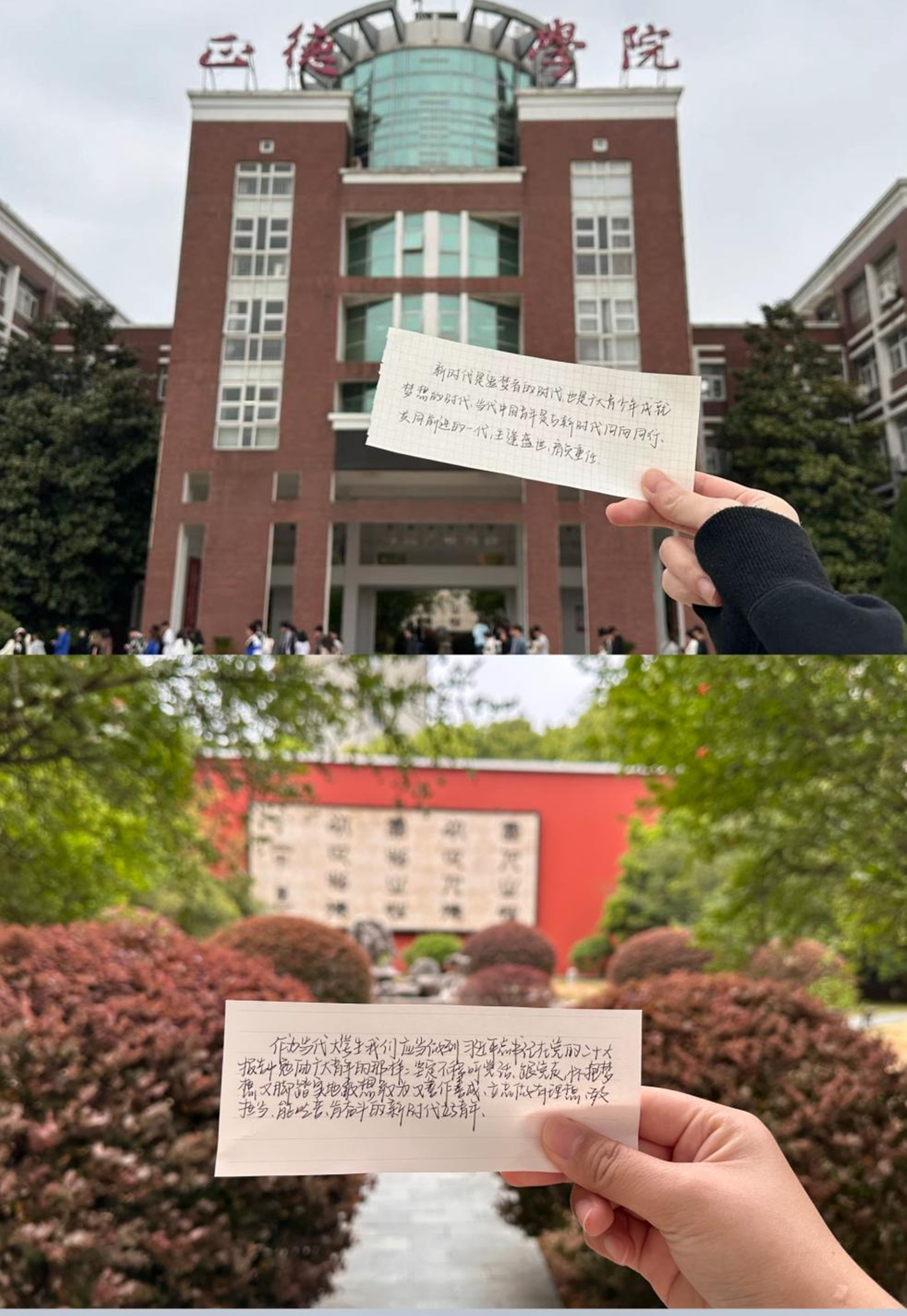 青年与时代相辉映,青年与祖国共奋进,青年是国家和民族的希望,青年要肩负使命、坚定前进内心,在人类的不懈奋斗中绽放绚烂之花!在本次主题团日活动中,民用航空系的团员们在正德校园内将自己对党的二十大胜利召开的感悟打卡拍照,通过手写祝福的方式表达对祖国母亲深厚情谊。以下是部分图片展示: