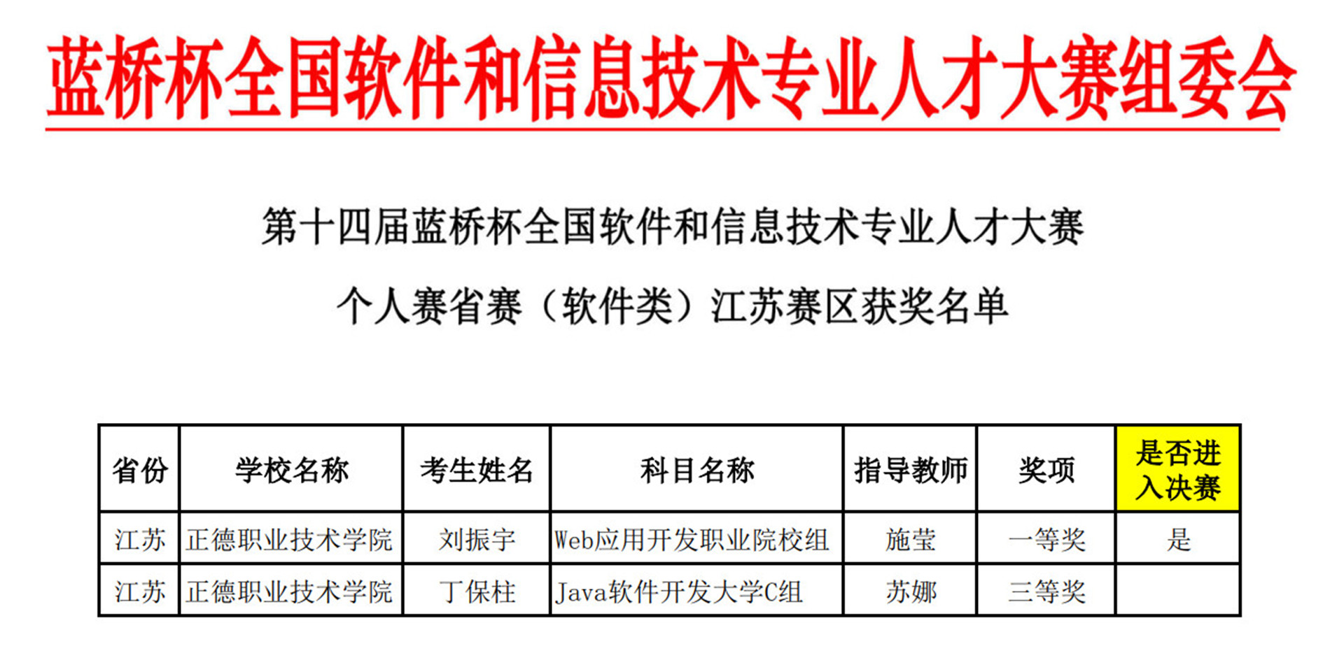 在第十四届“蓝桥杯”个人赛省赛(软件类)江苏赛区中,电子与信息技术系软件技术专业2021级学生刘振宇获省级一等奖、丁保柱获省级三等奖。其中,Web应用开发项目为av在线 首次参赛,获得历史性的突破,并闯入全国总决赛。