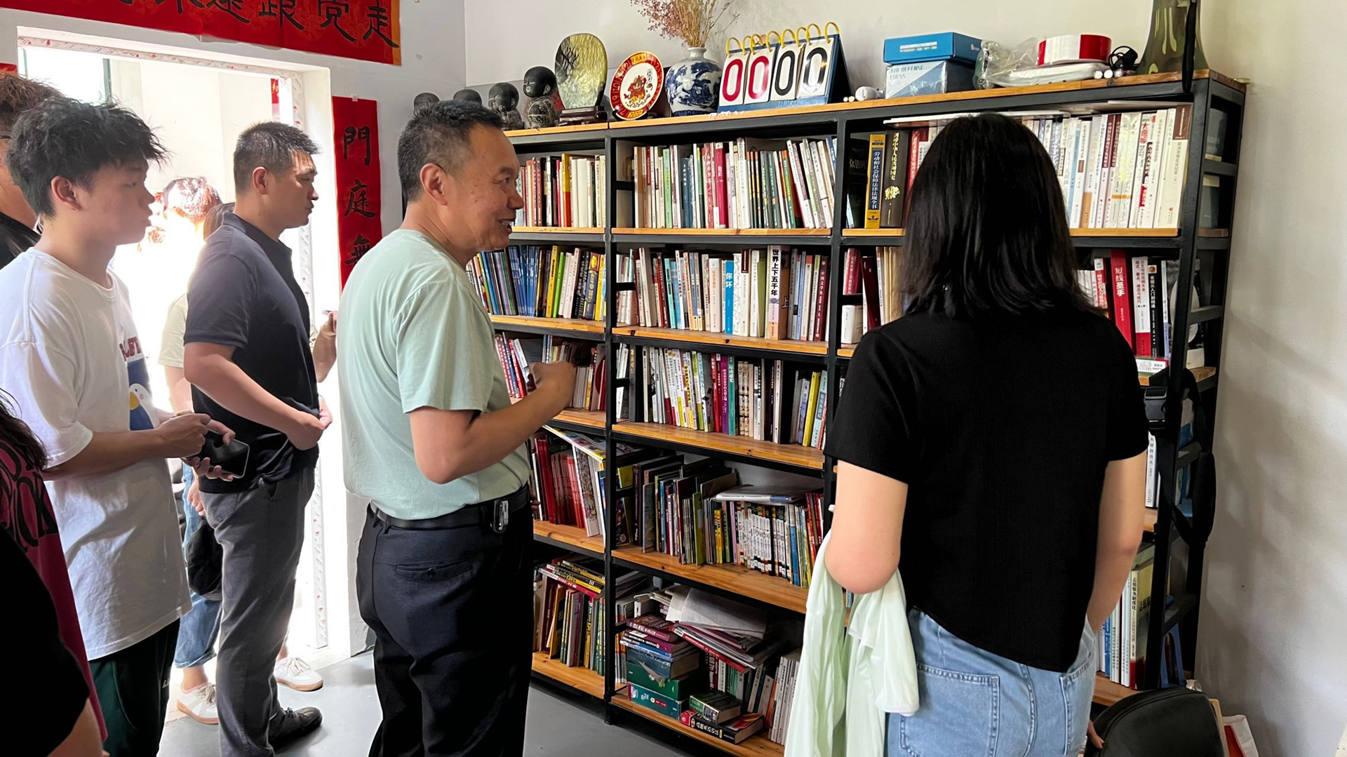 课后,戴老师带领大家参观了他一手创办的公益书房。 满屋的书籍都是戴老师挨家挨户征集过来的,“读万卷书行千里路”,戴老师恰恰是行万里路得万卷书。当他说到现在的书房每年假期都会有小学生、中学生过来自习,也有老人过来写写书法、练练画的时候,他的眼神一下子变明亮了,那种油然而生的自豪感引起了大家的共鸣。