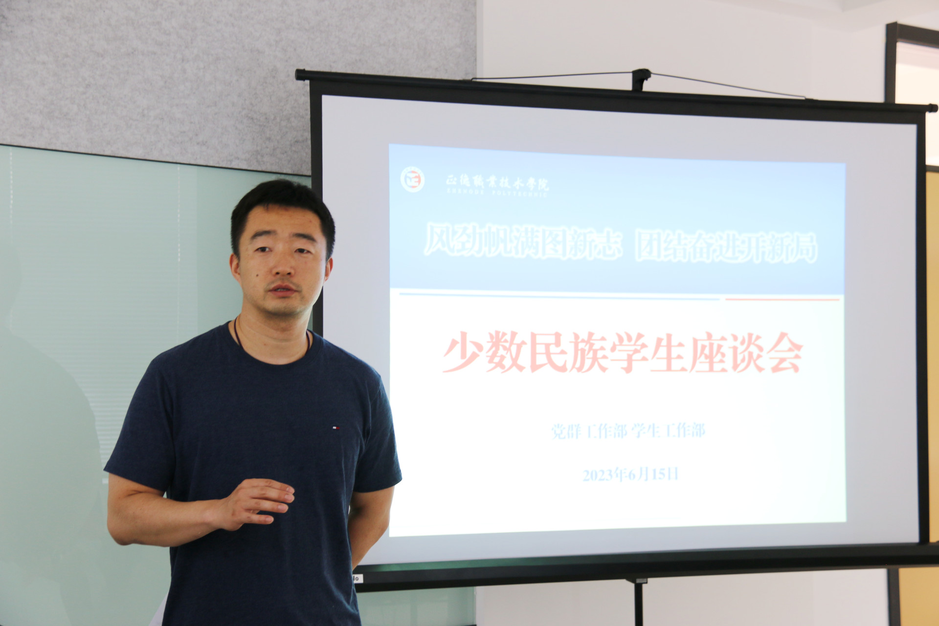 为深入学习贯彻习近平总书记关于民族团结进步工作的重要精神指示,进一步提升少数民族学生教育、管理和服务工作,铸牢中华民族共同体意识,促进各民族学生交往交流交融,6月15日下午,av在线 在“一站式”学生社区召开了少数民族学生座谈会,党群工作部副部长周慧、相关老师以及来自7个民族的16名少数民族学生代表参加了本次座谈会,座谈会由学生处副处长毛茂主持。