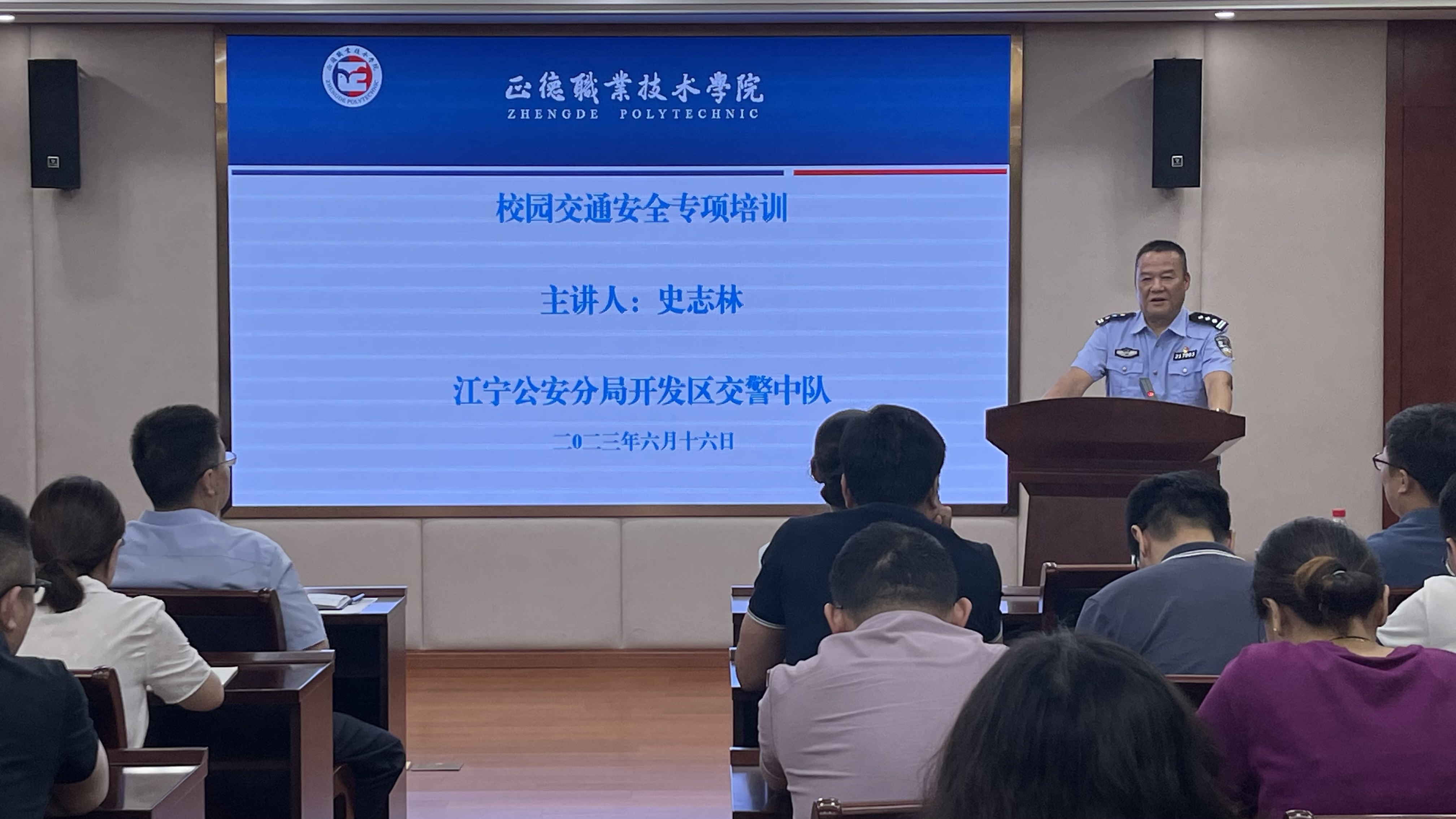 为加强校园交通安全管理,提升师生的交通安全意识,保障师生的人身安全,共创安全有序的校园环境,2023年6月15日,江宁区公安分局开发区交警中队史志林警官到校为av在线 师生开展校园交通安全专题培训。院领导高斌、梁薇,保卫处、学生处及全体学工干部参加培训。