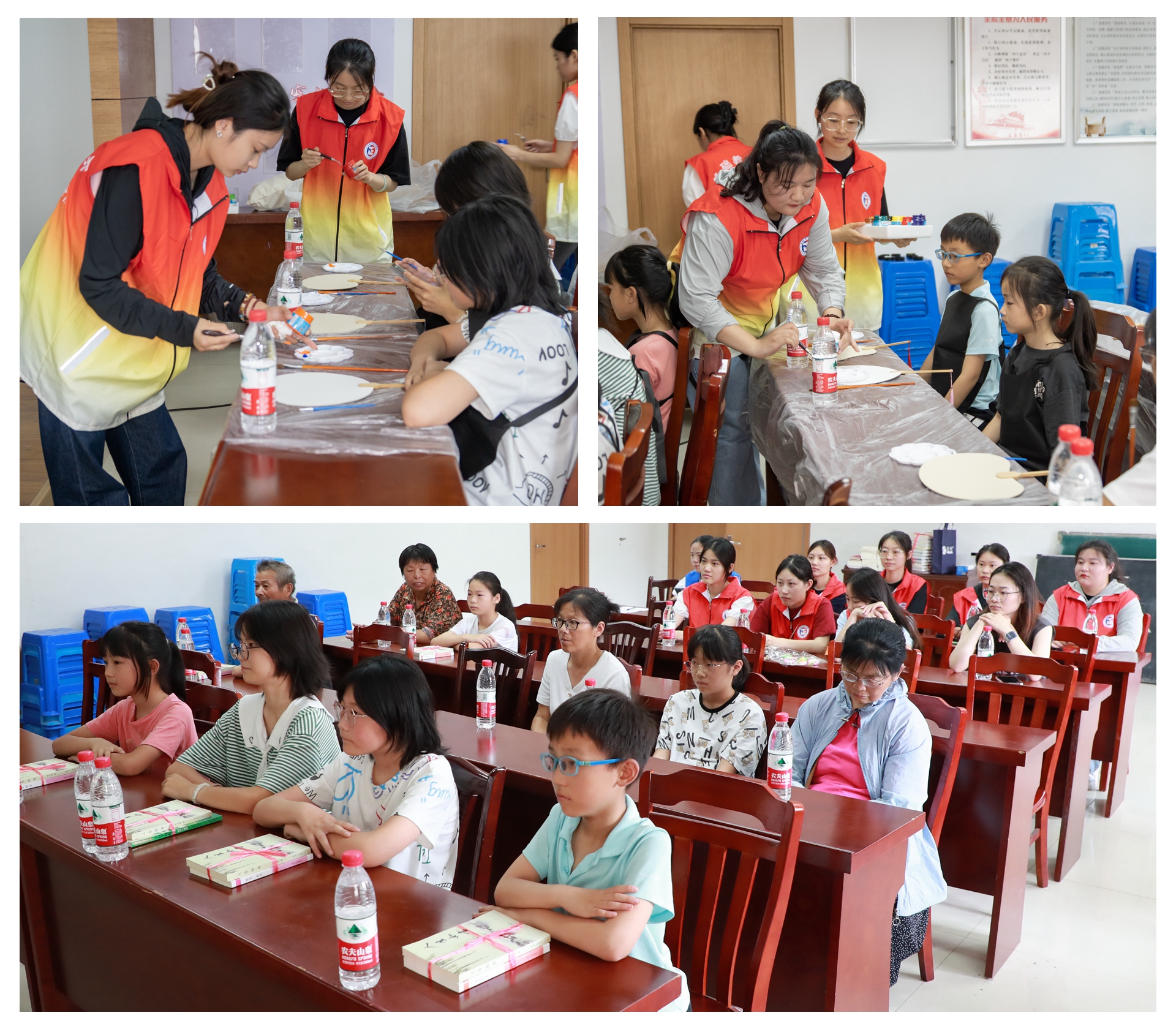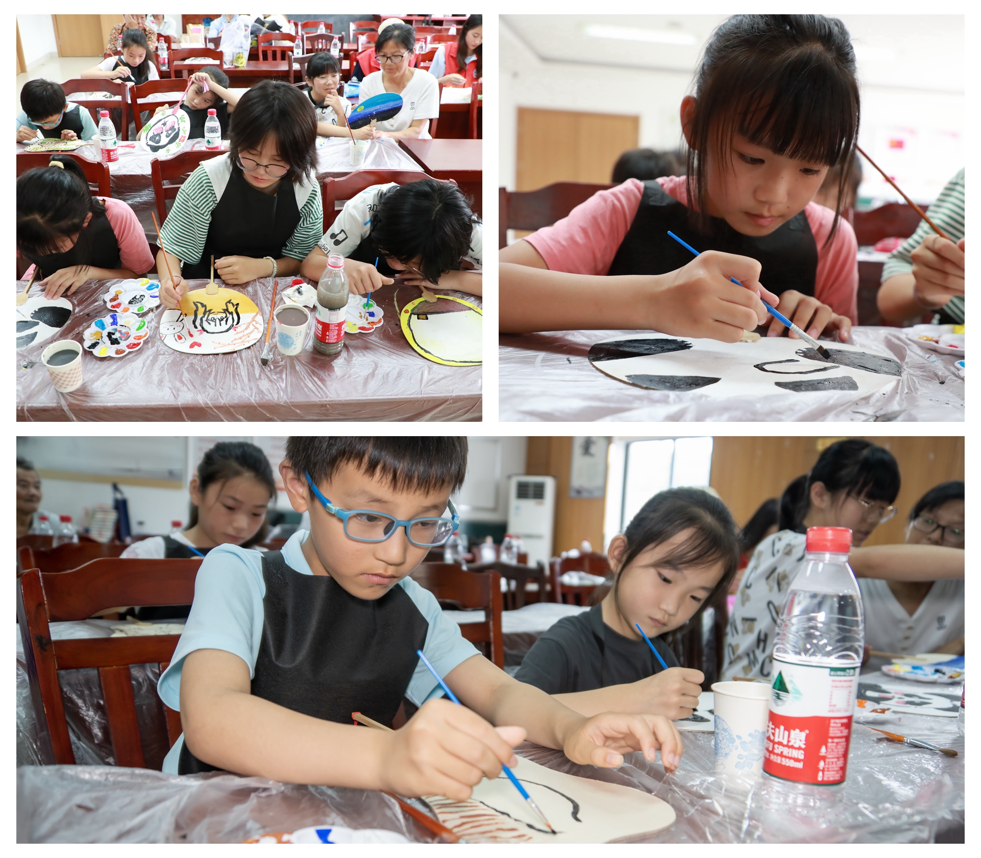 活动中,团队成员们通过面对面、互动式教学方式,教授小朋友们绘画制作技巧,每个小朋友都拿起画笔, 在小分队成员的指导下认真作画。熊猫、夜空、晚霞在孩子们手中用五彩的颜料绘制出来,一幅幅各具特色的团扇充分展示了孩子们活泼可爱、健康向上的精神风貌。