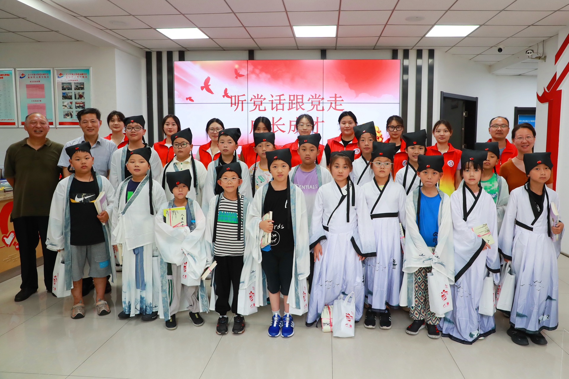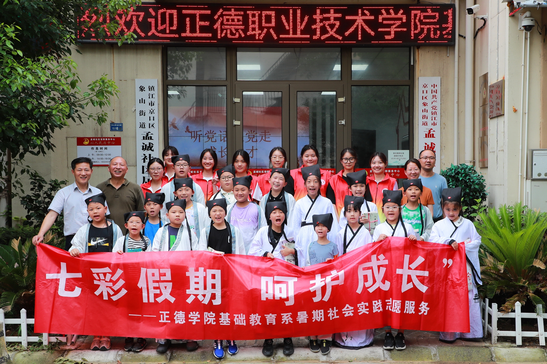 8月2日,团队成员们来到镇江市京口区象山街道孟诚社区,与象山街道关工委、江苏省华茂贸易有限公司共同举办“大手拉小手 传承中华传统文化”活动。象山街道关工委常务副主任姚家驹、象山街道孟诚社区党委书记戴伟、江苏省华茂贸易有限公司主任李健、基础教育系刘婧老师出席了本次活动。