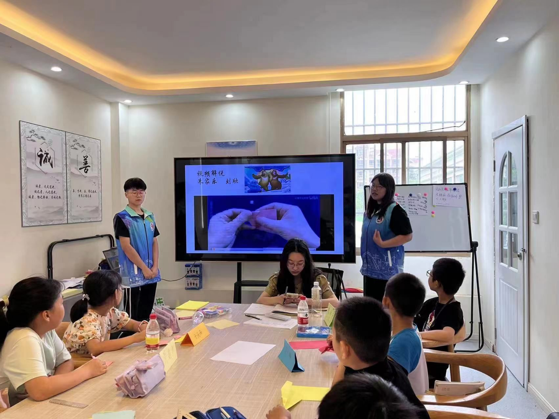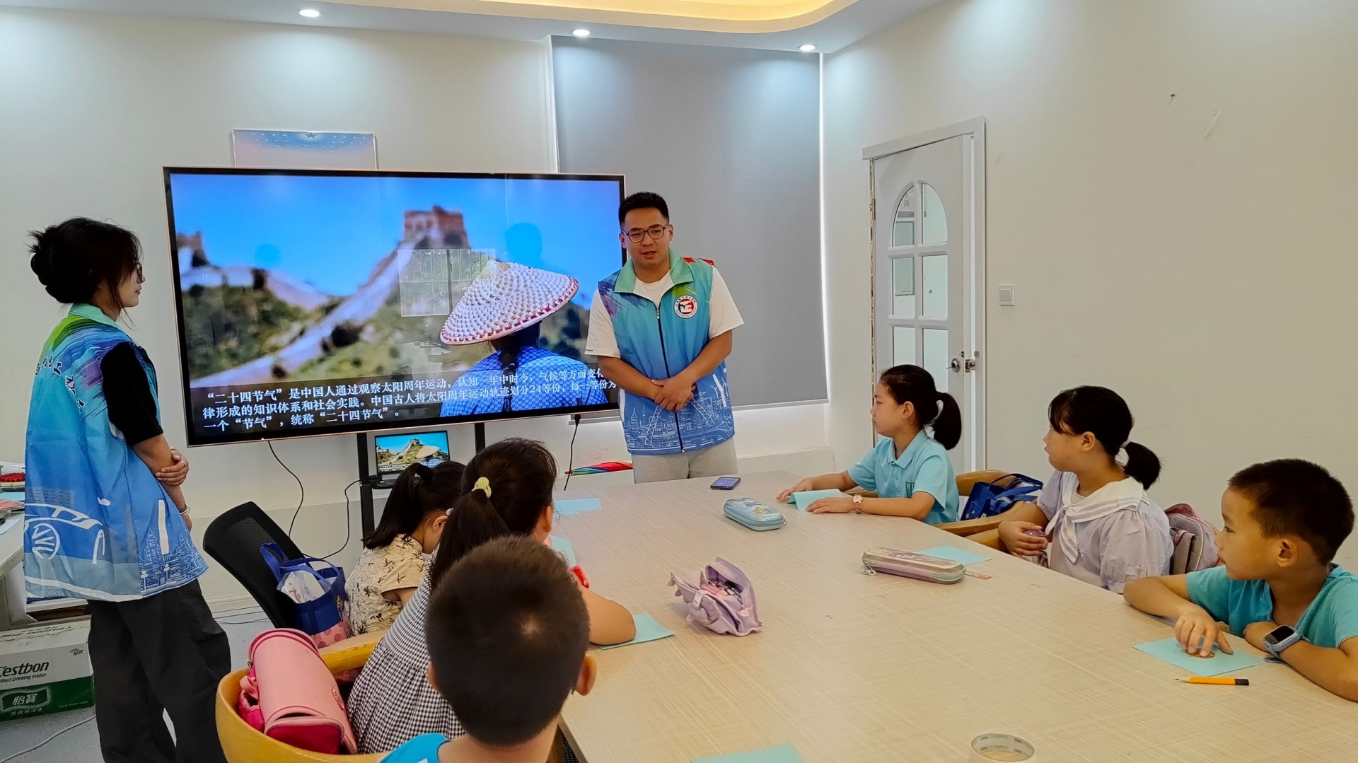 课堂上,志愿者们先为小朋友们讲解暑期安全注意事项,希望大家可以度过一个快乐安全的假期。课中通过认识二十四节气,小朋友们了解到地球自转、四季变化以及农事节令制定,深入了解每个节气的特点和习俗。在问答环节中,小朋友们仔细寻找藏在古诗词里的二十四节气,了解到二十四节气是中华民族传统文化的重要组成部分,也是中华民族智慧的结晶。