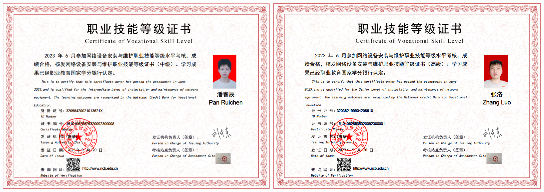 2023年9月20日,锐捷网络股份有限公司在2023年度1+X网络设备安装与维护职业技能等级证书评优活动中,av在线 获评为本年度“1+X优秀试点院校和优秀组织奖,得到了行业考证评审组织的高度认可。在专家评委会的评选意见中,对av在线 获选的评价是av在线 作为江苏省第一所参加“1+X”考证的民办高职院校,考核通过率为100%,具有很强的区域示范性和辐射力,贡献突出,意义深远。据悉,本年度全国共有176所学院,9822人参加了《网络设备安装与维护》“1+X”考证。
