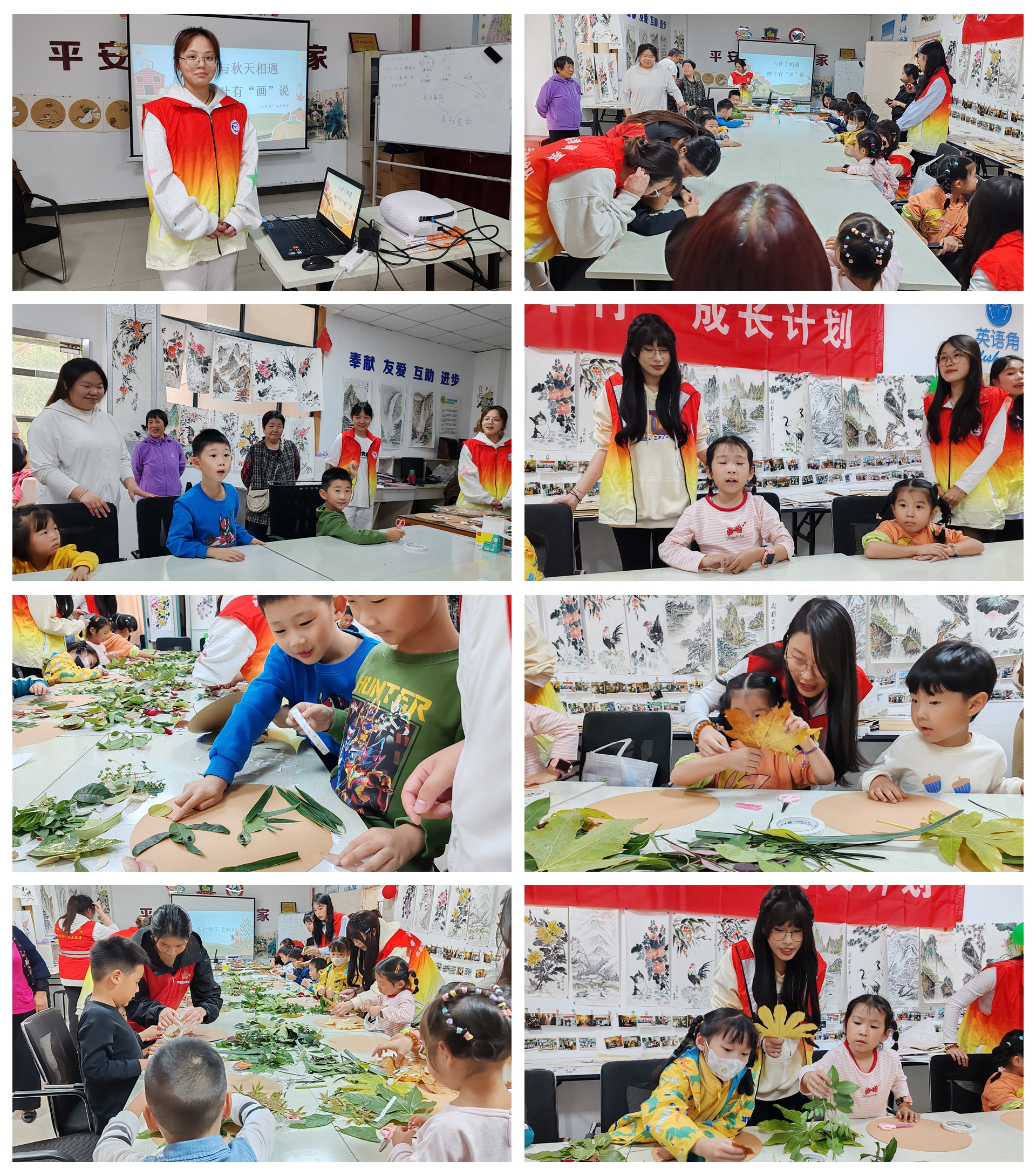 东篱菊酒秋风过,满目唯留落叶频。秋天,落叶为大地披上了黄金裳。活动开始,首先,学生们给小朋友们讲述了秋天的故事,引发他们思考秋天树叶为什么变黄、为什么落下,什么是“一叶知秋”,小朋友们热烈抢答,现场气氛活泼,充满了童趣。随后,引导小朋友们观察树叶的形状、颜色,发挥他们的想象力,激发他们的创造性,培养他们的动手能力,将收集到的树叶裁剪成需要的形状,拼接出各种图案,让一片片树叶变成一幅幅优美的图画。