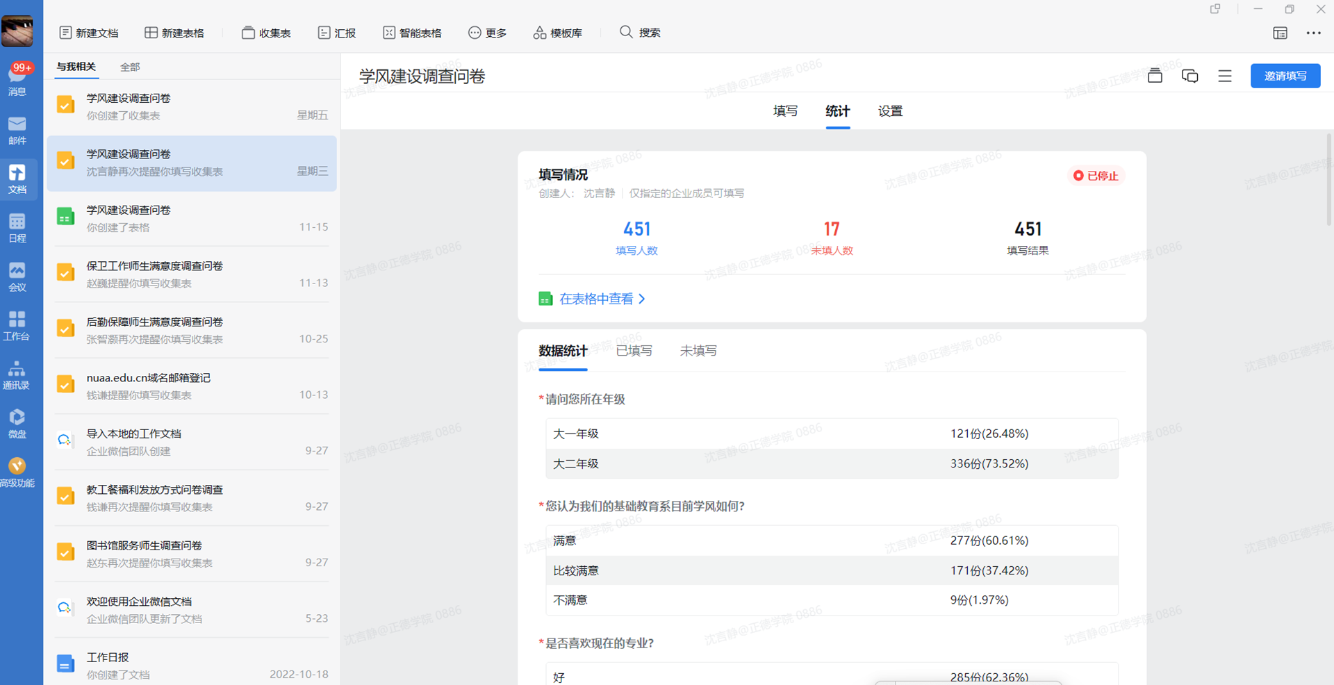 为更好的掌握学生在校学习期间的各类学风诉求,精准的解决学风建设的难点问题,基础教育系在本月已对大一、大二全体在校生通过线上问卷调查形式开展促进学风问卷调查,涵盖了专业认同、学风满意度、职业目标、考证需求、课堂教学等共计22项内容,系里将根据问卷反馈结果,认真疏理与研判,推进措施创新,提升促进优良学风的精准化。
