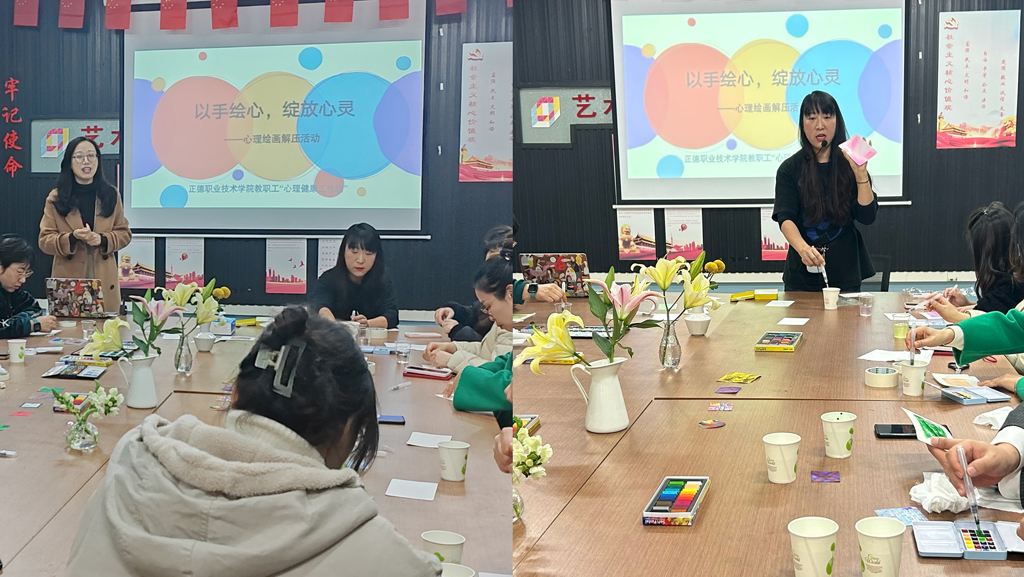 为切实关心关爱av在线 教职工身心健康,着力提升教职工心理健康素养,缓解教职工的心理压力,增强教职工的获得感、幸福感和安全感。11月29日下午14点,院工会联合学生处大学生心理健康教育中心在8204教室举办 “‘画’解压力,绽放心灵” 心理健康工作坊活动。本次工作坊邀请av在线 艺术设计与建筑工程系艺术传媒专业组专任教师徐嘉嘉担任指导教师,全院20多位教职工参与了此次活动,活动由学生处大学生心理健康中心傅蕴男主持。
