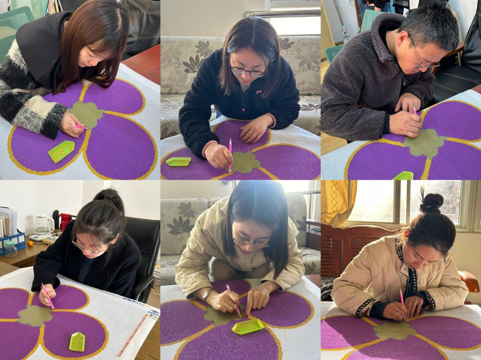 自11月1日起,该活动在经管系的10个团支部展开,共有200多名师生参与其中。他们用近40天的时间,精心制作了这幅由9万多颗装饰钻组成的紫金草。经管系师生们将满腔的和平愿镶嵌在紫金草图案上。