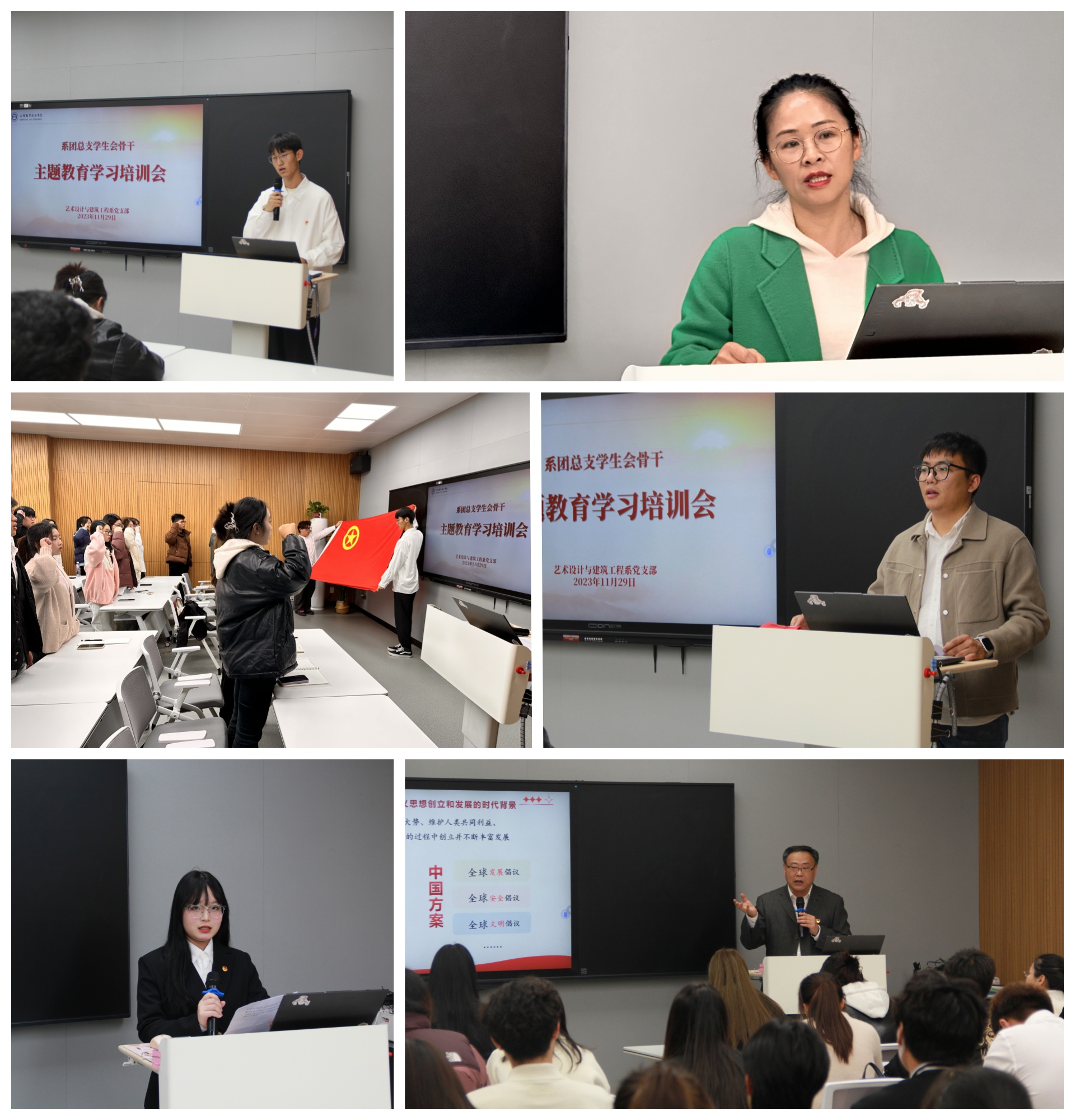 党性教育。政治理论学习是青年党员增强党性修养的根本途径,艺建系积极组织主题教育专题学习,深入学习习近平新时代中国特色社会主义思想。各学生团支部通过“三会一课”深入学习《习近平新时代中国特色社会主义思想摘编》、青年大学习主题教育专辑。截至目前,学习已覆盖入党积极分子、发展对象、青年党员2000余人。11月29日系党支部邀请了思政教研与公共教学党支部书记、思政教研部主任杨卫东为艺建系系全体团干部及系学生会骨干作主题教育的培训,会议由团总支书记崔杰主持,杨卫东以“开辟马克思主义中国化时代化新境界”为主题给大家讲了一堂生动的思政课,培训会上同学们针对学习内容进行分享交流,系党支部书记做总结发言,培训会最后全体团员面向团旗重温入团誓词。