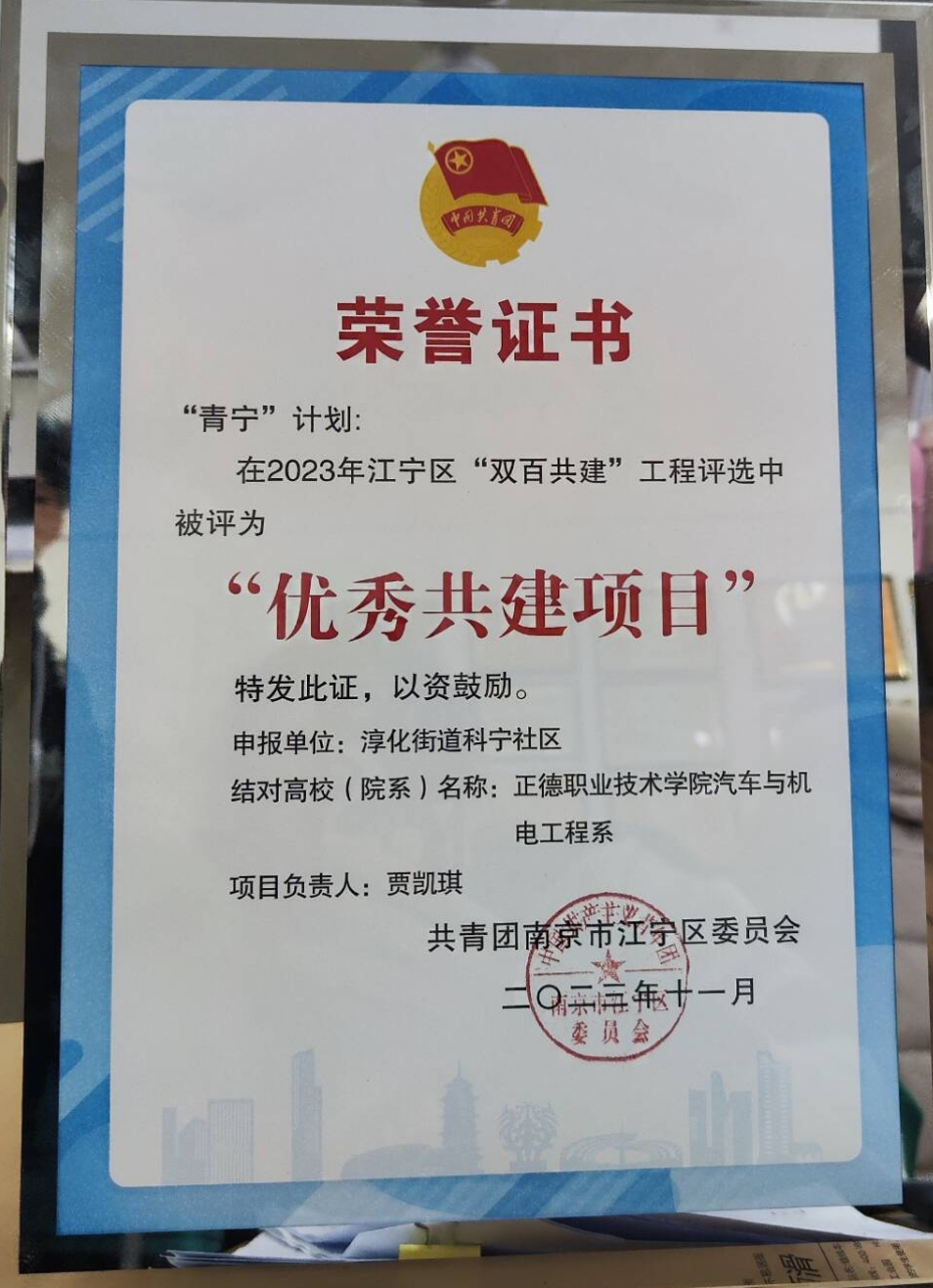 汽车与机电工程系荣获共青团南京市江宁区“优秀共建项目”