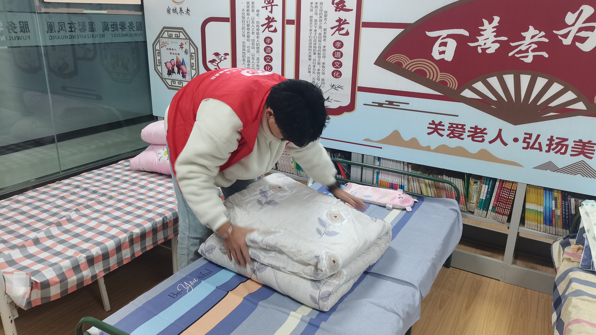 于昆池同学前往家乡宿迁市幸福街道凤凰社区成为一名志愿者,在社区的安排下帮助敬老院老人整理床铺、书籍,与老人交流。通过这次志愿服务,不仅传递了社会的关爱和温暖,也让更多的人关注到了老年人的生活状况和需求,他表示,希望未来能够有更多这样的活动,让更多的人参与到关爱老年人的行动中来。
