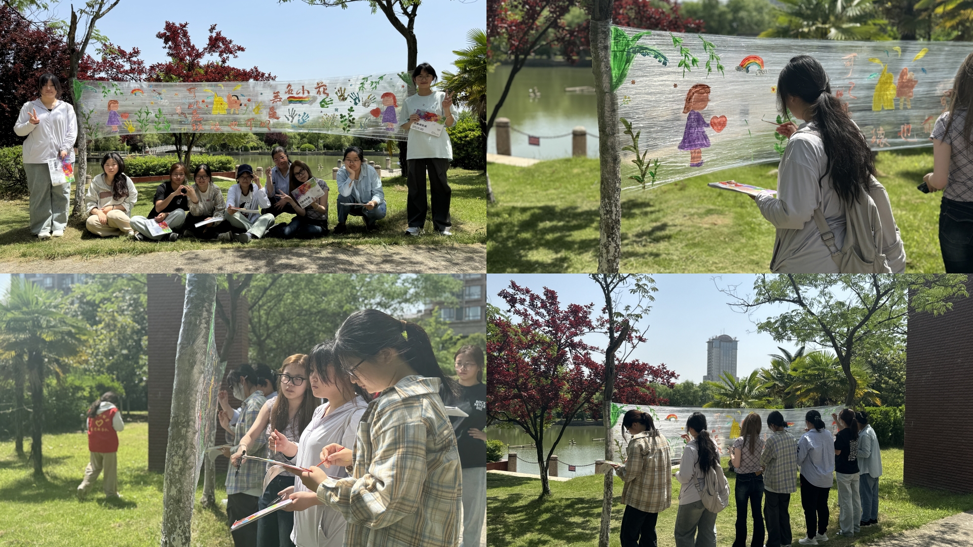 在学院钢琴湖畔的树木上,同学们以保鲜膜为画布,用画笔描绘出了一幅幅充满深意的心理健康画作。这些画作或展现积极情绪的力量,或描绘面对困境时的坚韧与勇气,或表达自我接纳与成长的喜悦。每一幅画都凝聚了同学们对心理健康的深刻理解和感悟。