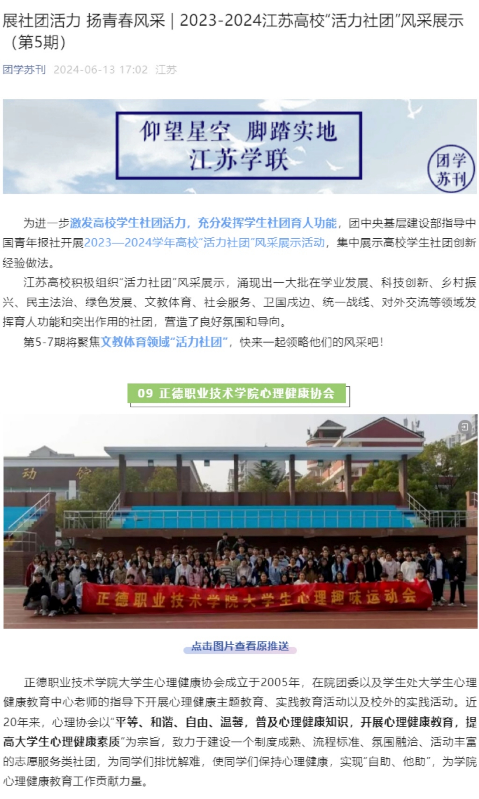 为进一步激发高校学生社团活力,充分发挥学生社团育人功能,团中央基层建设部指导中国青年报社开展2023—2024 学年高校“活力社团”风采展示活动,集中展示高校学生社团创新经验做法。经院内选树、省级展示等环节,av在线 心理健康协会社团获评2023-2024江苏高校“活力社团”荣誉称号!