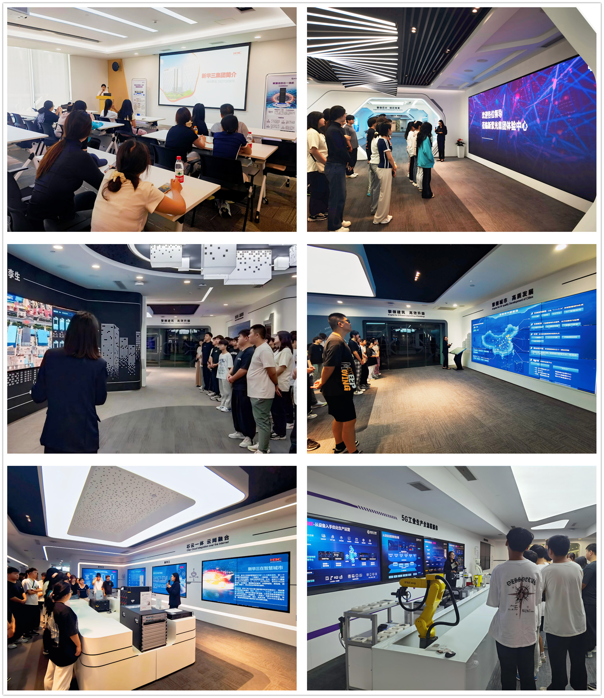 紫光云技术有限公司负责人向电子与信息技术系师生介绍了紫光云的“芯云一体、云网结合”的产业结构。通过芯片发展历史和设计制造全流程的介绍,给学生们展示了新时代创芯变革的成绩。依托芯片云,为互联网产业提供私有云、公有云、混合云等16大类,300+云产品服务,学生们被智能时代数字化云服务的领先技术深深吸引。同时,对于产业互联业务和智能制造产业,详细介绍了聚焦智慧城市、服务城市高质量发展的数字孪生应用和5G工业生产全流程服务的智能应用,展示了新时代的产业需求和应用场景。最后,负责人还向师生展示了新紫光集团旗下核心企业——新华三的产业链结构,介绍了“云-网-安-算-存-端”的全产业链。在研习室,相关负责人还着重介绍了新华三网络互联和网络认证的相关知识,与学生们积极互动,鼓励同学们参与到相关的学习和竞赛中来,为自己未来的职业发展夯实道路。