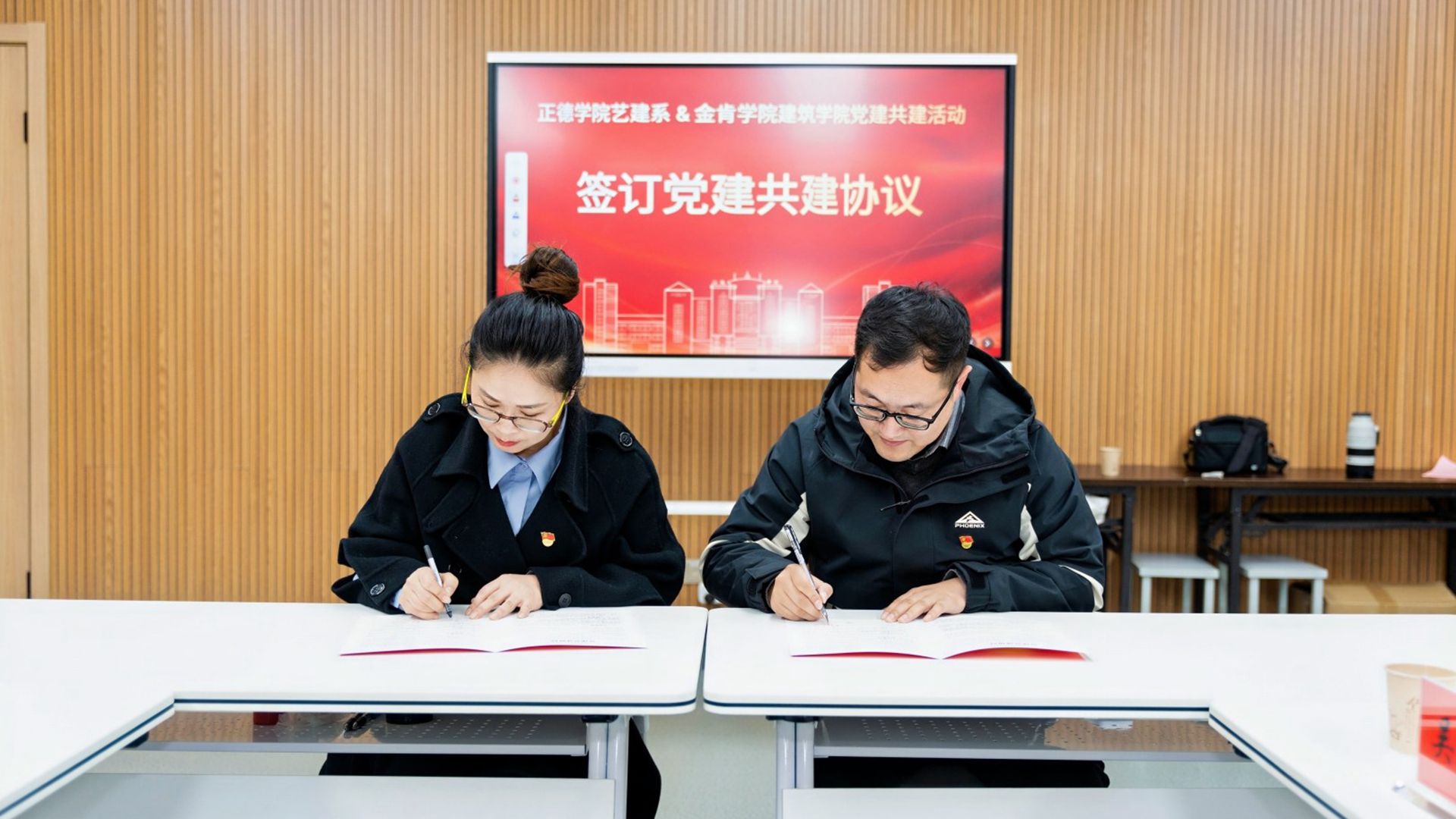 在双方代表的共同见证下,正德学院艺建系与金肯学院建筑学院正式签署了党建共建协议书。这一协议的签订标志着两院在党建共建方面迈出了坚实的一步,也预示着双方将在未来的合作中携手共进,共同书写党建引领发展的新篇章。