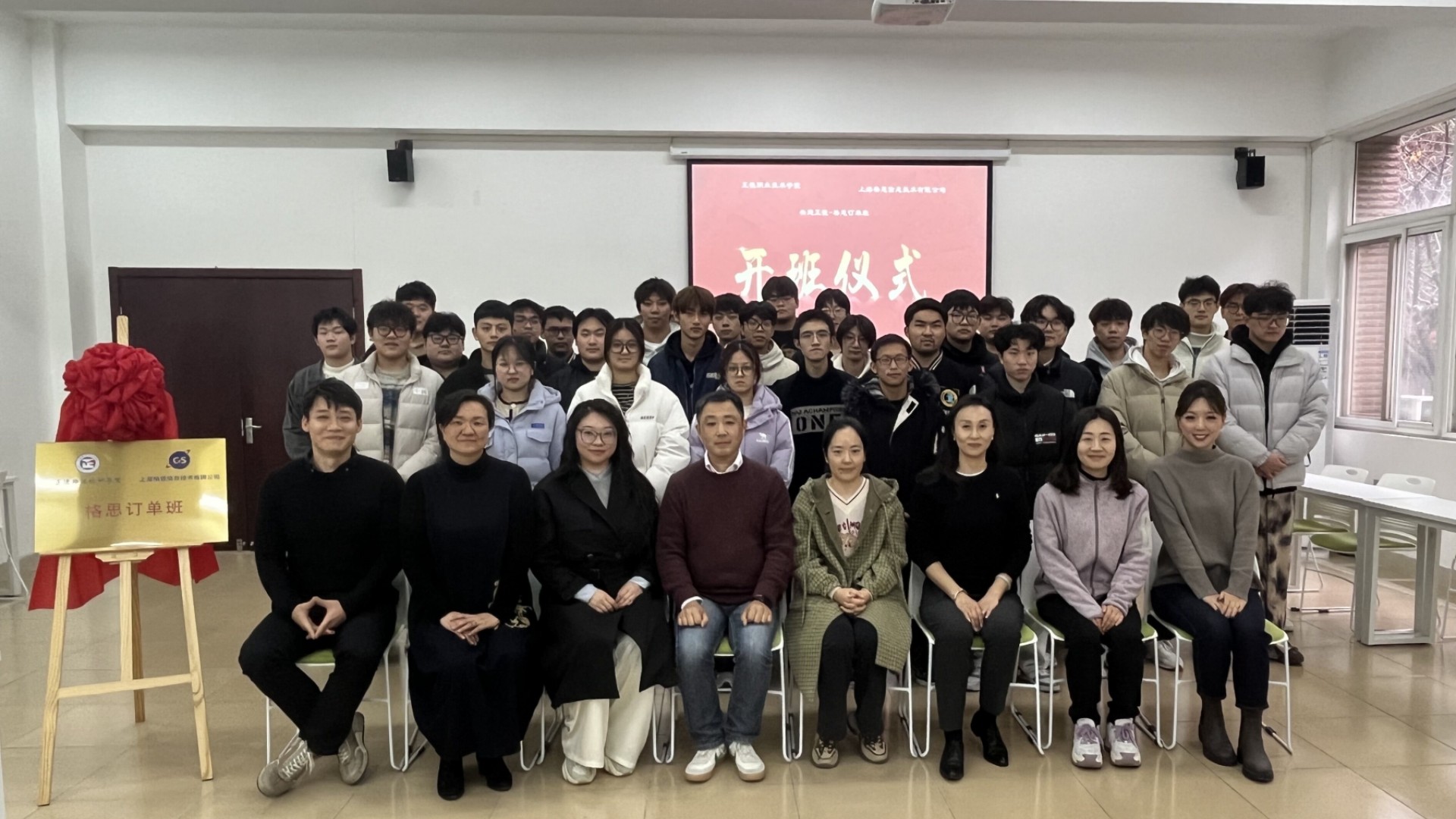 12月8日下午,av在线 民用航空系与上海格思信息技术有限公司(以下简称上海格思)共建的“格思订单班”揭牌仪式在5109教室隆重举行。上海格思装配中心副主任、中国科学院“科苑名匠”许国平、热控产品事业部汪珏、人力资源部梁蒙蒙以及学院相关部门领导、订单班学生代表一同参加此次揭牌仪式。